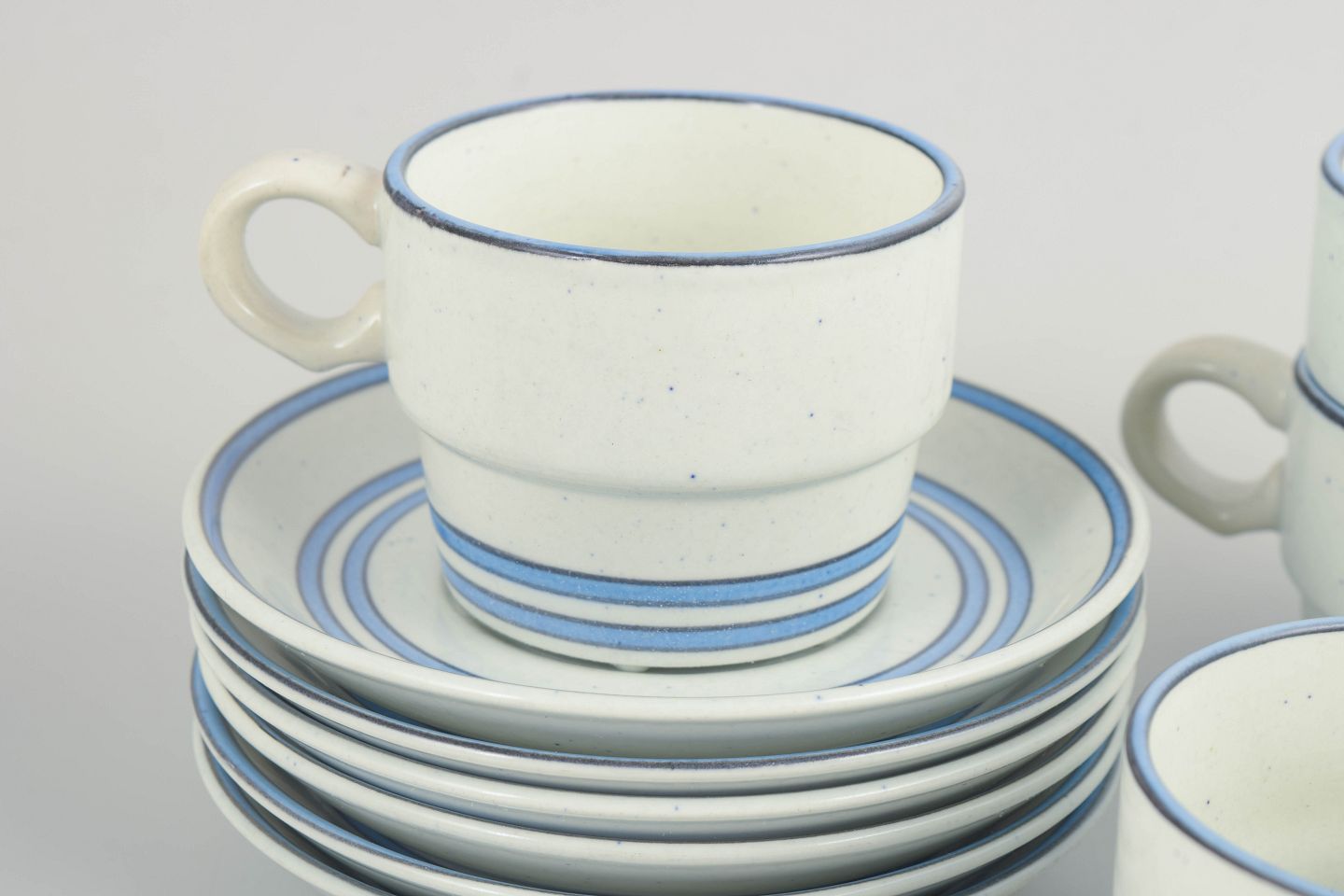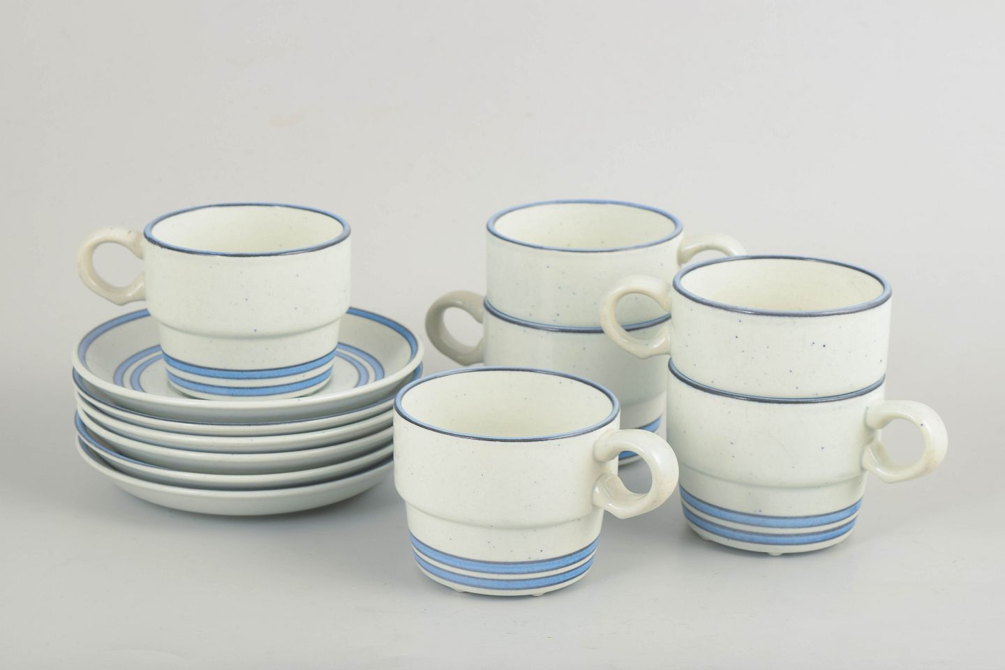 Set of six coffee cups with matching saucers in faience. The series features simple cylindrical forms, gently curved handles and restrained blue line decoration on a light ground, characteristic of Stig Lindberg’s functional and graphic design language. Produced according to Gustavsberg’s “Dart” model.