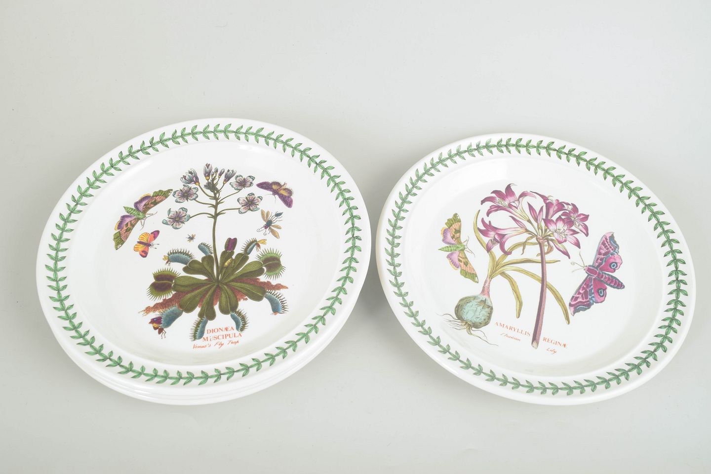 Set of 4 large faience dinner plates by Portmeirion, decorated in “The Botanic Garden” series with a botanical motif and the characteristic green leaf border.