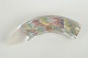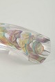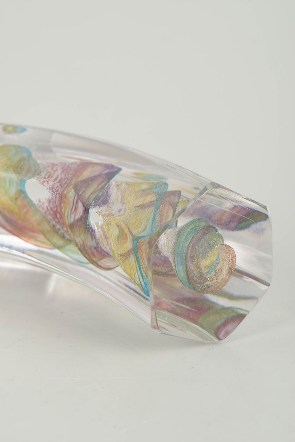 Curved sculpture in clear art glass with encased multicoloured, iridescent organic patterns; studio work, numbered 80/250.