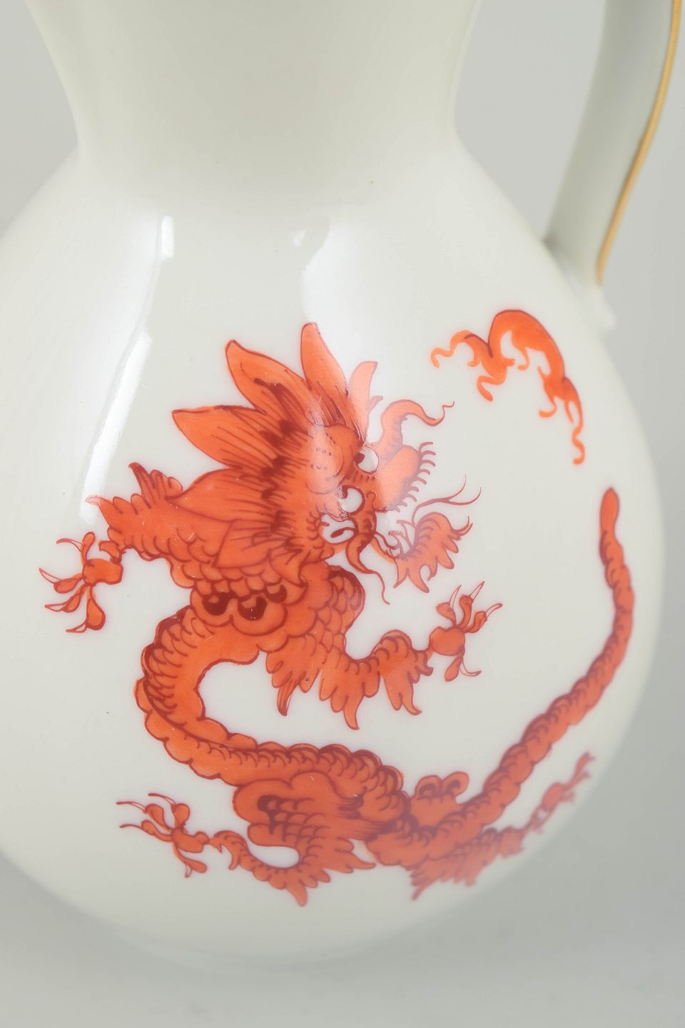 Baluster-shaped jug in white-glazed porcelain decorated with a red Ming dragon and a gilt rim. The model was produced in the Meissen area and is not made by the Royal Meissen manufactory.