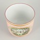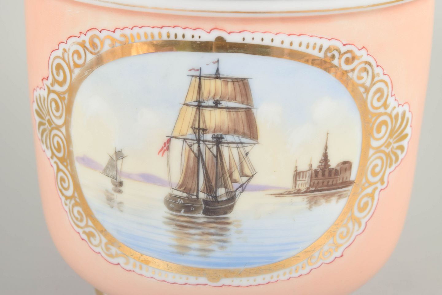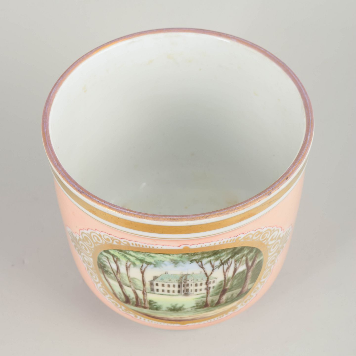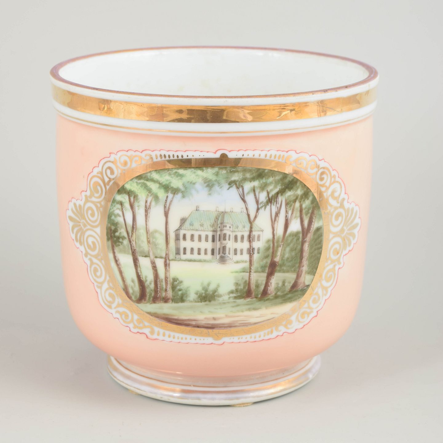 Round, slightly conical porcelain vase with an opalescent pink ground and a hand-painted view of Bernstorff Palace and Kronborg Castle set within a park landscape with tall trees in the foreground. The scene is framed by an ornamented cartouche and finished with a gilded border along the rim. The form is classically inspired with a low foot ring.