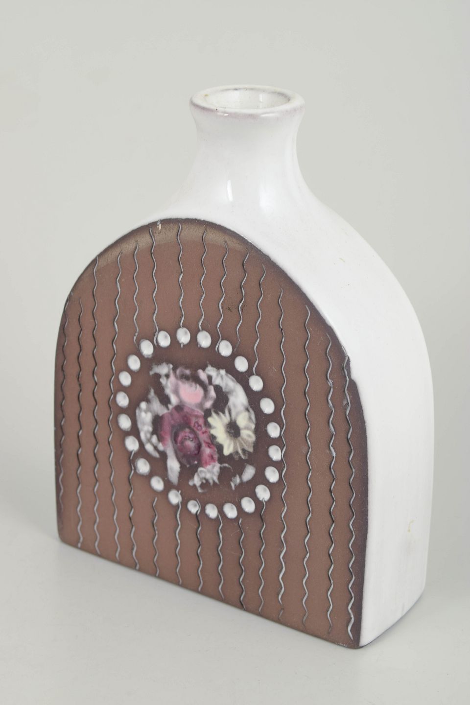 Figurative vase with a stylised female portrait decorated with flowers and geometric ornaments in relief and coloured glaze.