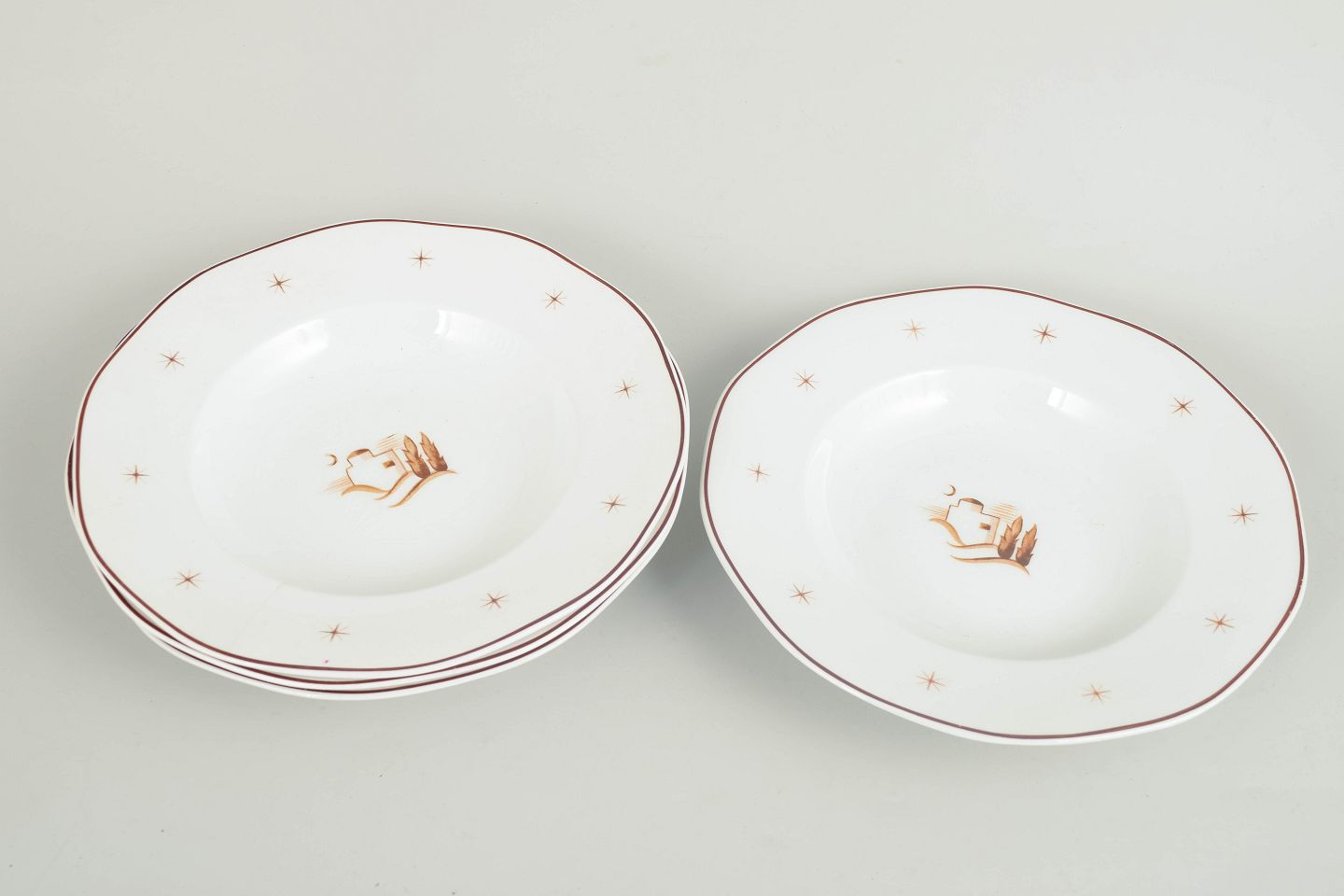 Deep plates in glazed earthenware with a scalloped rim, brown border line and star motifs, featuring a central oriental landscape motif. Orient model.