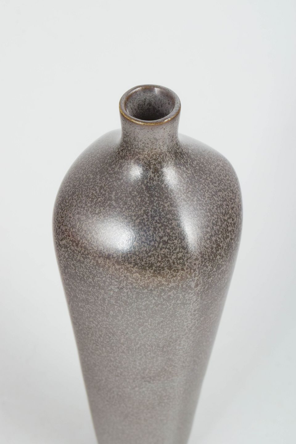 Large thrown stoneware vase with slender baluster form and narrow neck. Executed in a grey-brown hare’s fur glaze from the Selecta series. Stamped Gustavsberg and Selecta on the base. Model Selecta.