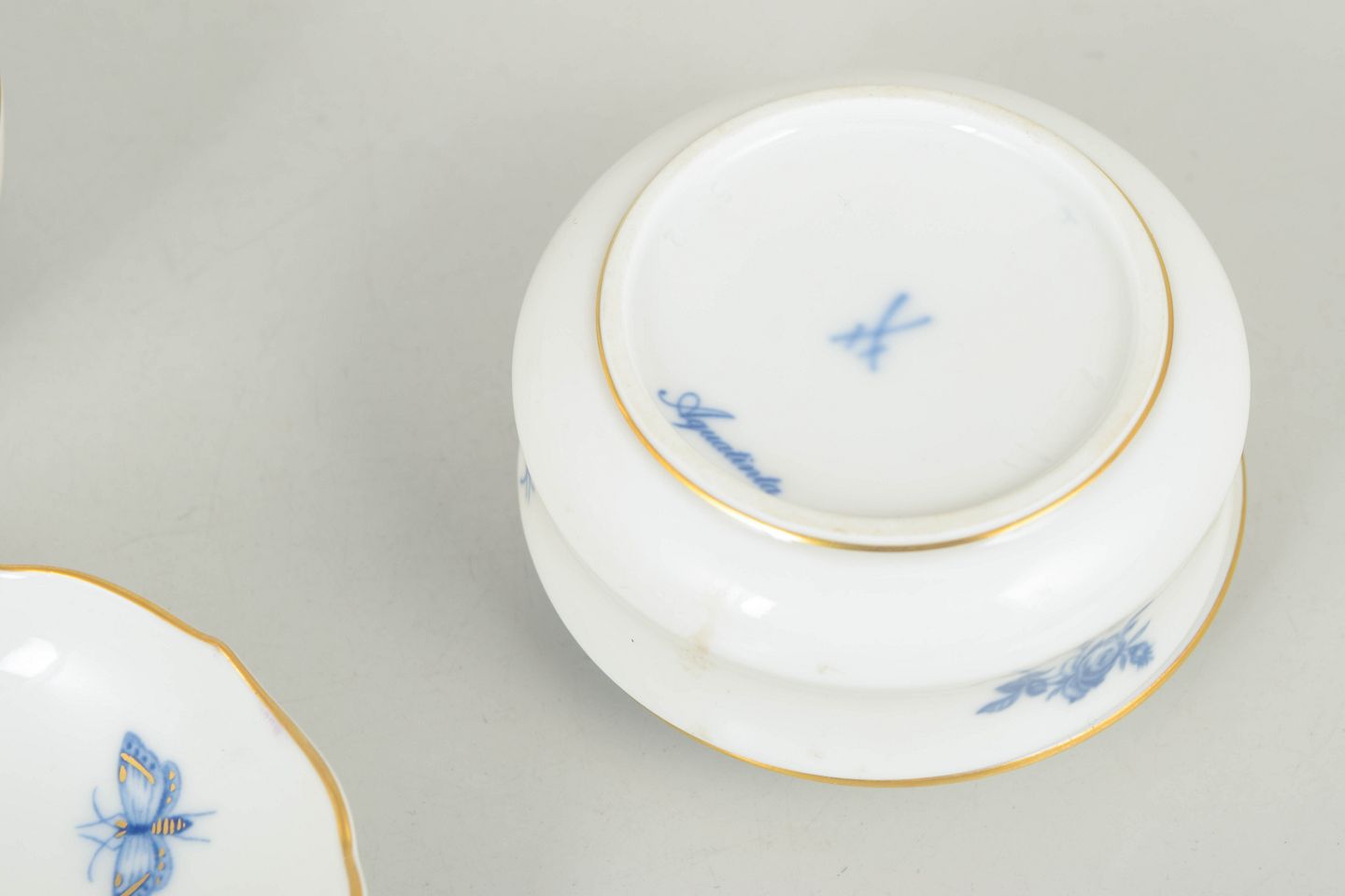 Two lidded jars and a small dish decorated with floral and insect motifs in blue tones with gilt rims. Model Aquatinta. Marked with Meissen crossed swords, first factory quality.