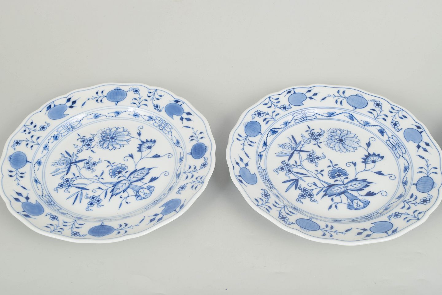 Three porcelain dinner plates with hand-painted blue decoration in the classic Blue Onion pattern. First factory quality, marked with Meissen crossed swords. Diameter 24 cm.