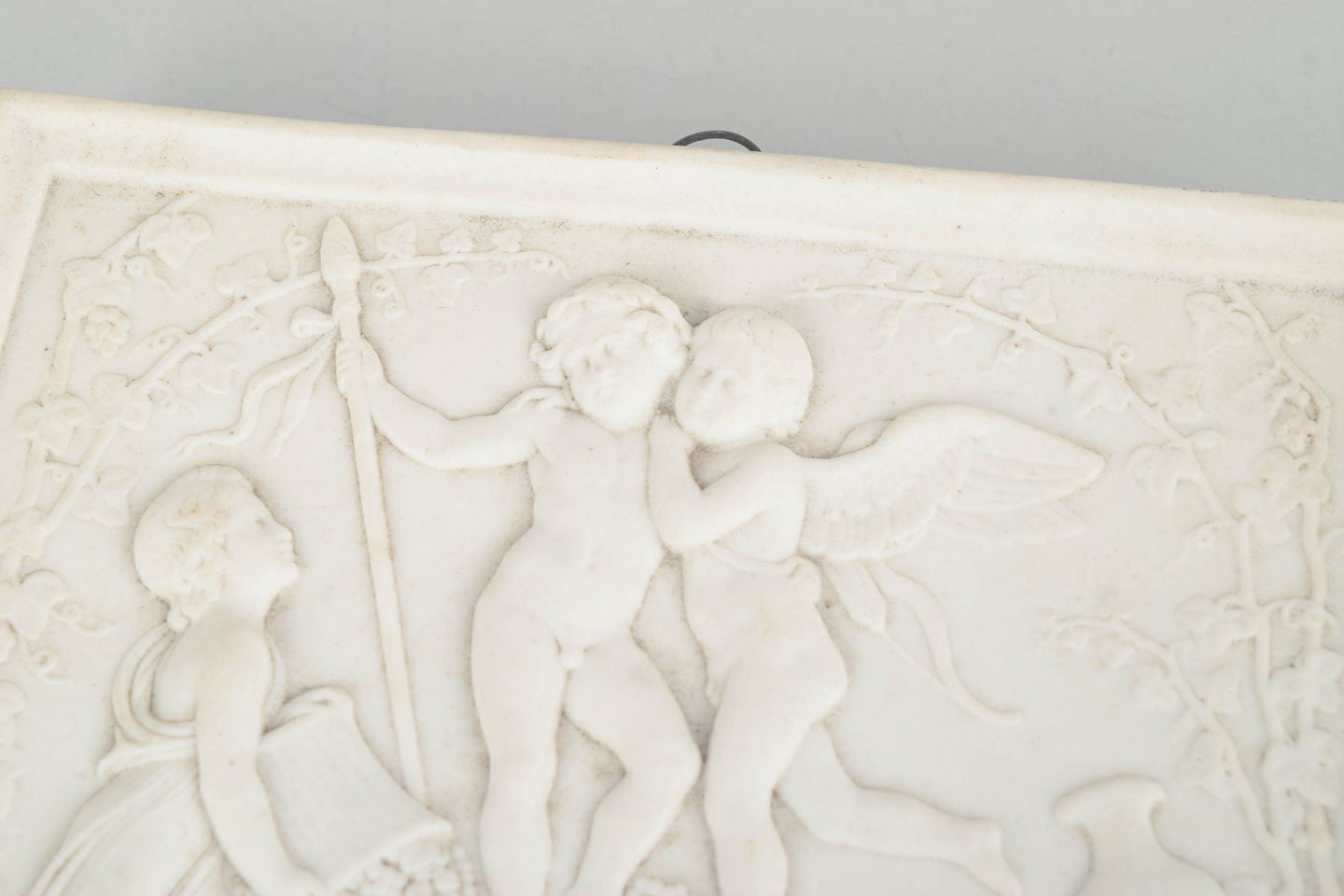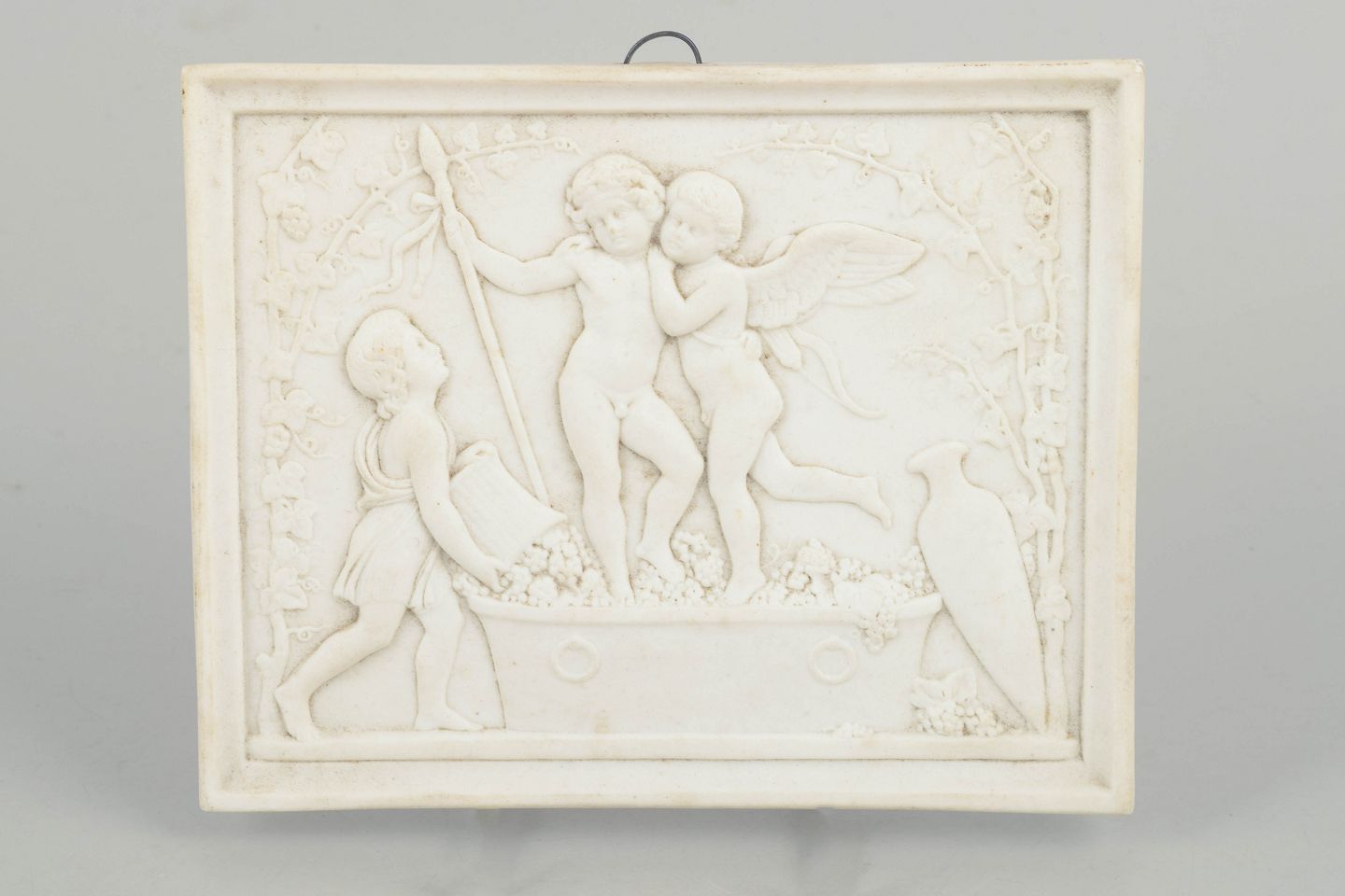 Rectangular wall relief in white biscuit porcelain depicting a classical composition with putti after Bertel Thorvaldsen, executed with refined detailing and soft modelling in the neoclassical style.