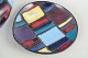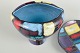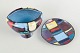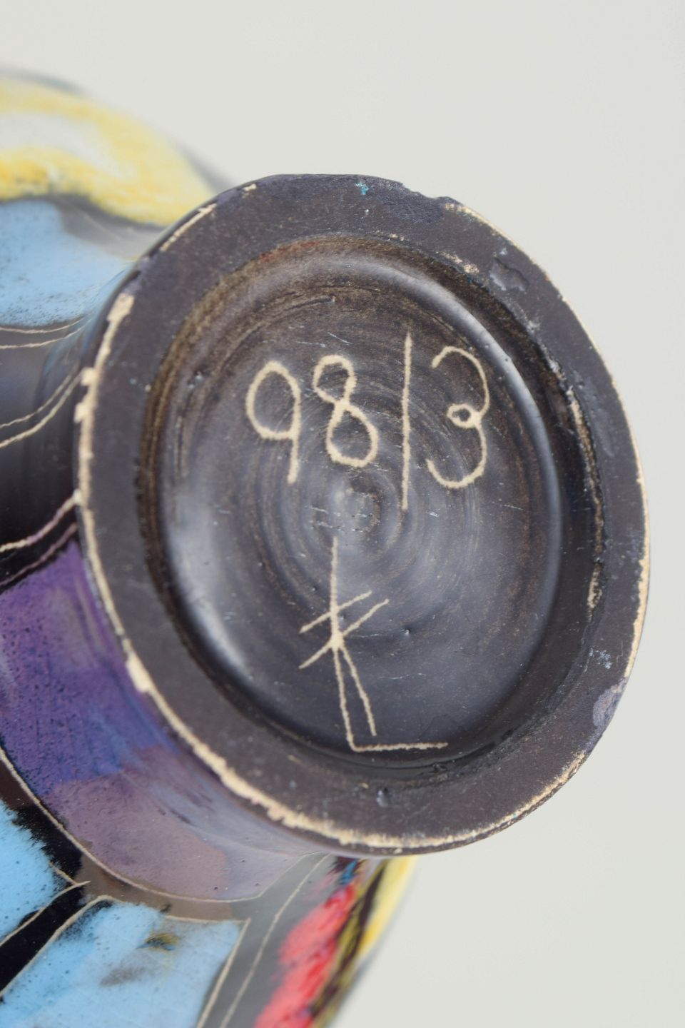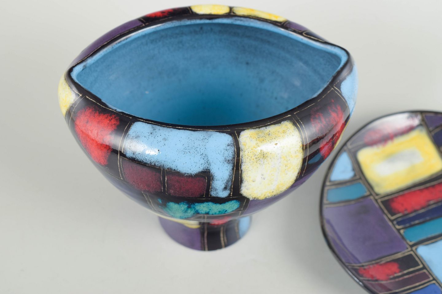 Decorative ceramic vase with integrated foot and matching dish, featuring a multicoloured glaze with abstract fields in blue, red, yellow, and violet tones. A characteristic example of mid-20th century German art pottery.