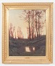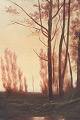 Atmospheric landscape depicting slender trees by a stream in warm evening light, executed in a naturalistic manner with soft transitions and a subdued colour palette. Signed lower.