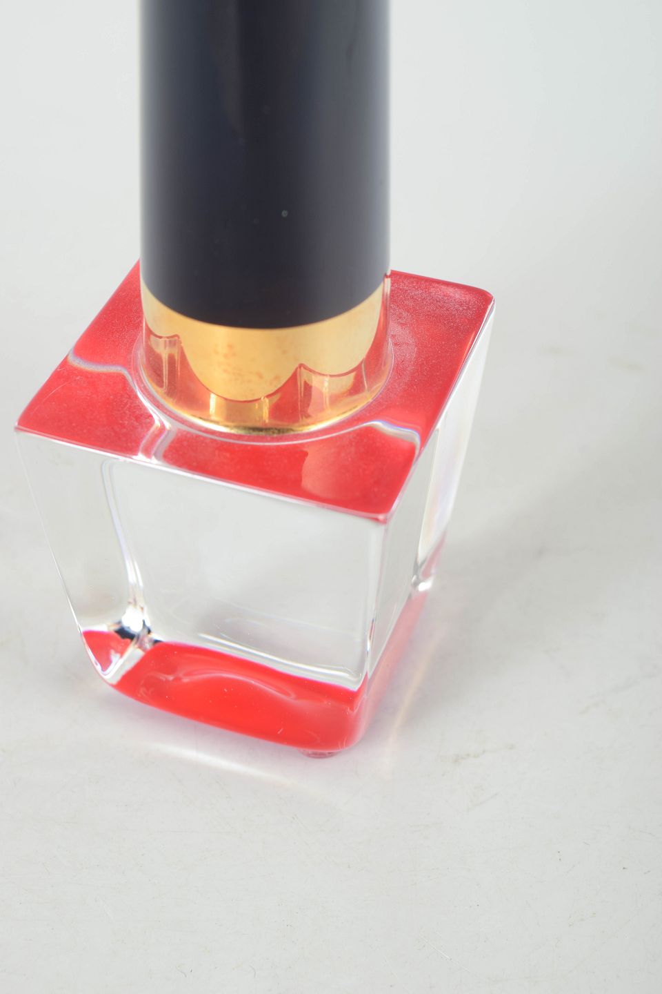 Geometric glass sculpture in the form of nail polish, executed in clear and coloured glass with a solid square base and a cylindrical top in a dark tone.