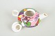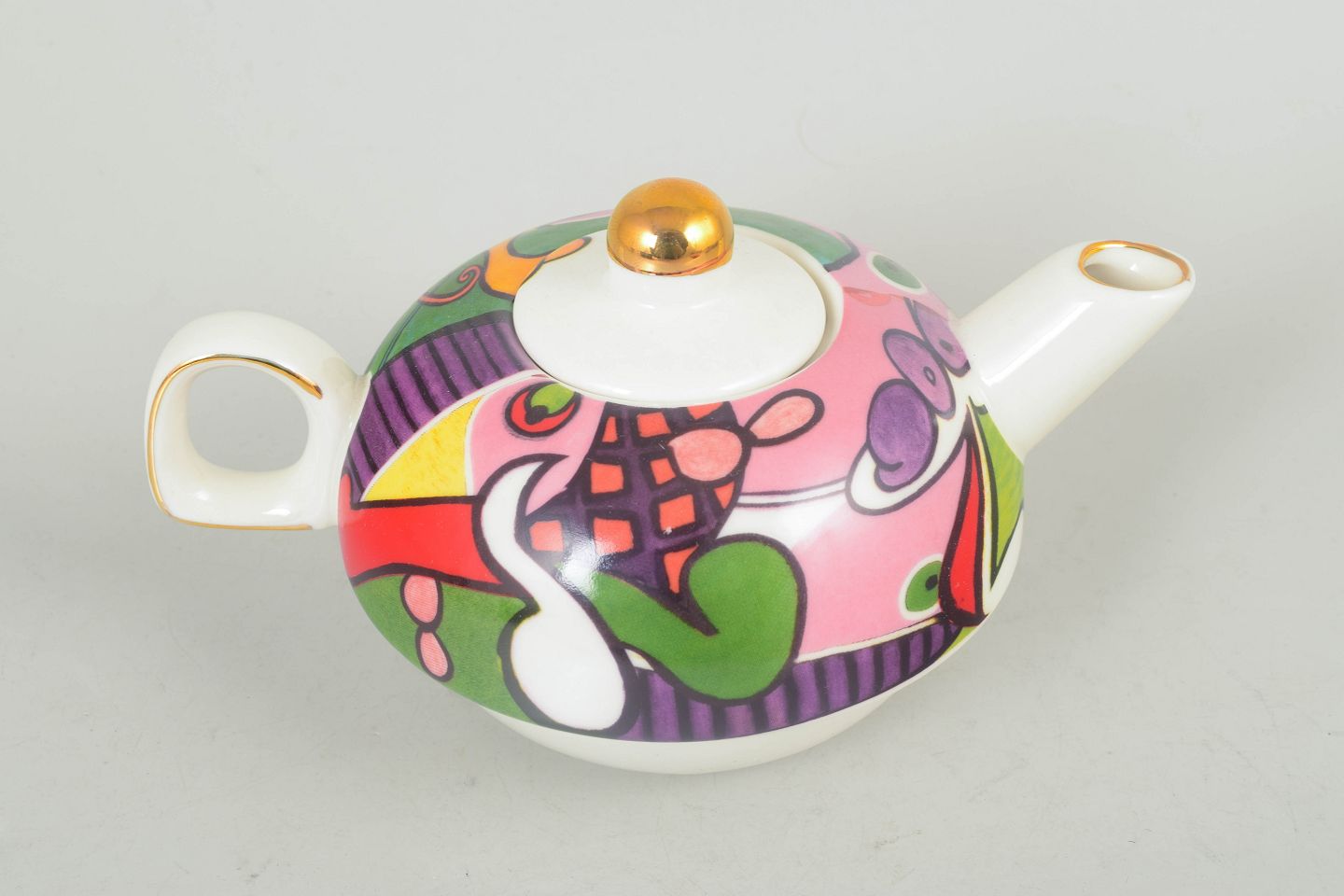 Porcelain teapot with lid, marked Picasso. Rounded form with colourful decoration in strong contrasts and gilt details on the finial and spout, typical of late 20th century production.