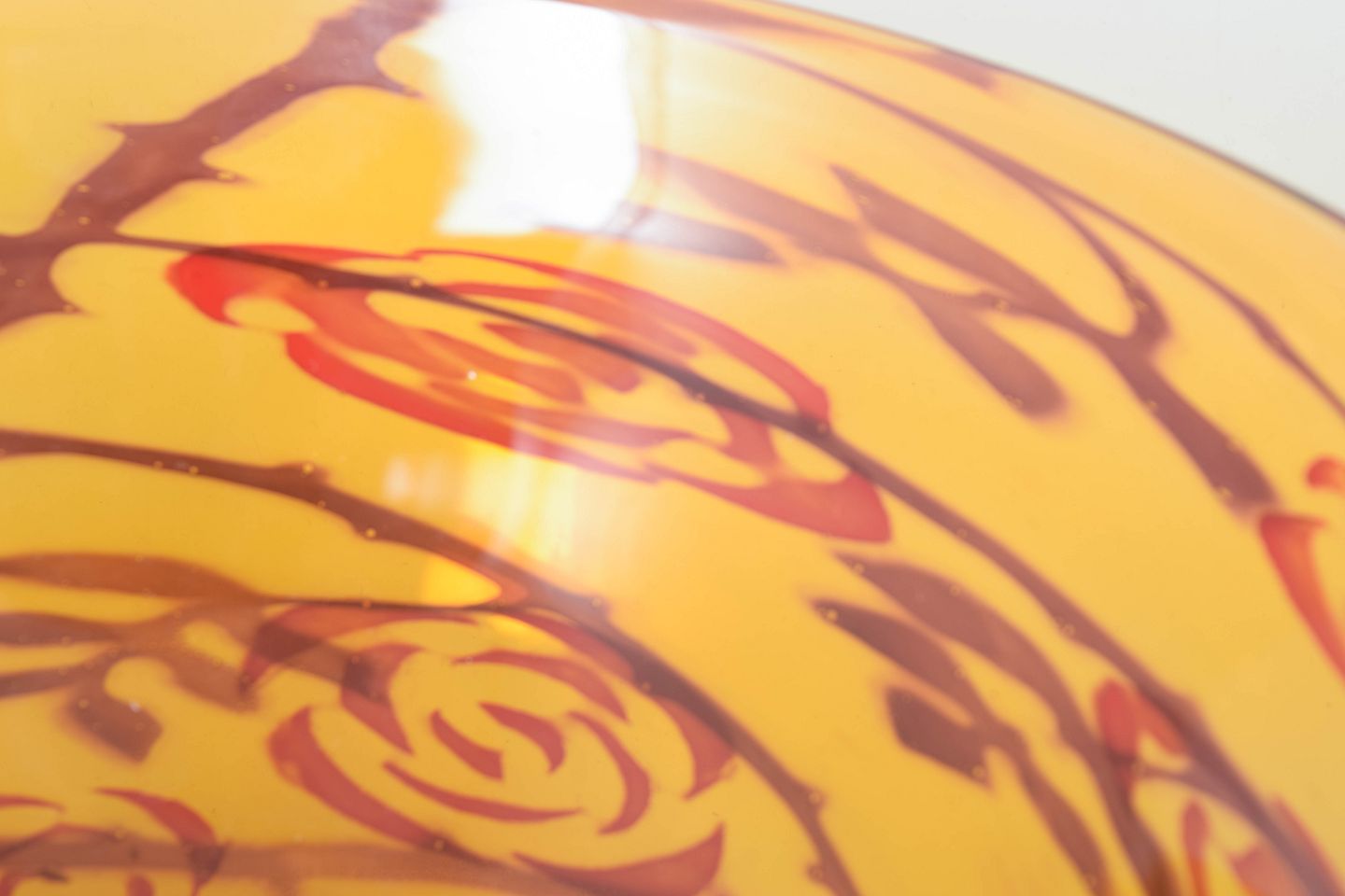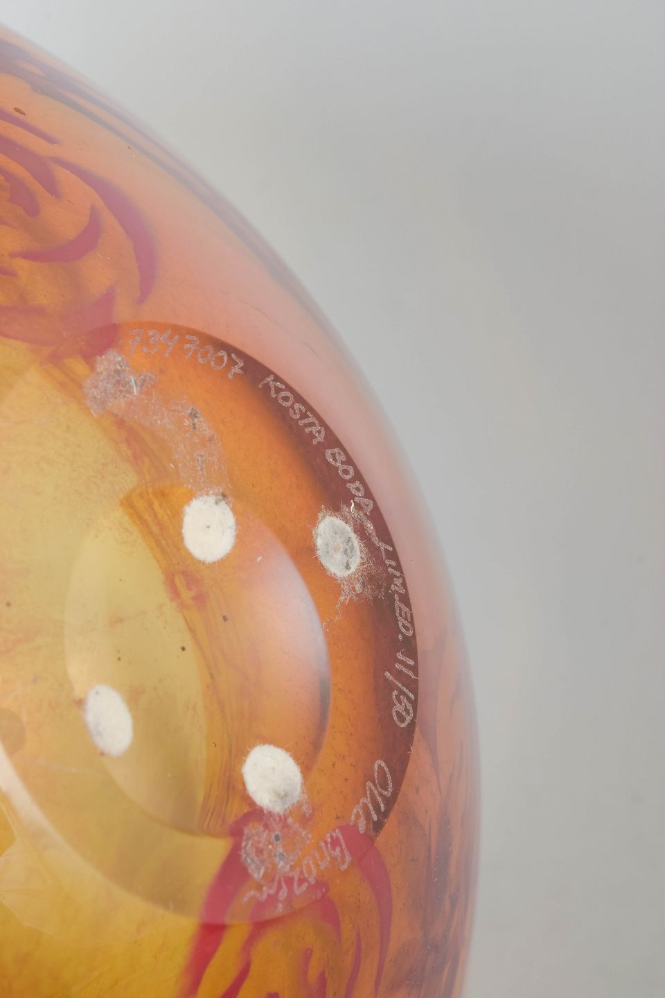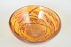 Large hand-blown glass bowl with warm colour tones in orange, amber and red with a decorative pattern. Signed on the base Kosta Boda, model 7347007, edition 11/50.