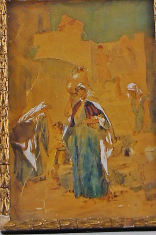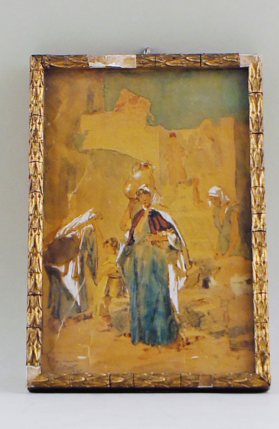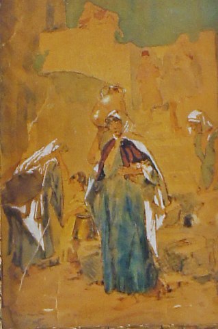 Gouache, Benjamin Constant (1845-1902) Oriental motif, woman carrying water jug. Gouache on paper, in good condition, slightly cracked paper (can be restored) needs a clean. Signed Benjamin Constant 1885. 20 x 13 cm.