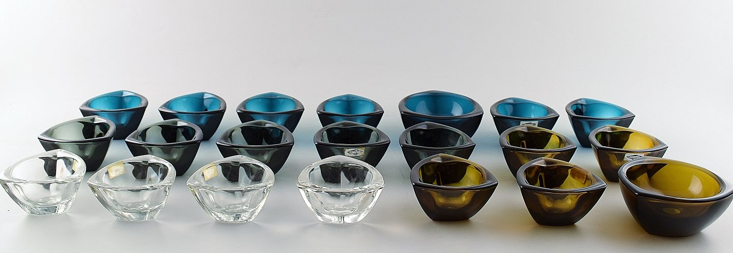 Kaj Franck (Finnish, 1911-1989) Nuutajärvi Glass Works, Wärtsilä Finland art glass, a total of 21 bowls of different colors. Measures : 9 x 5 cm. and 7 x 5 cm. In perfect condition.
