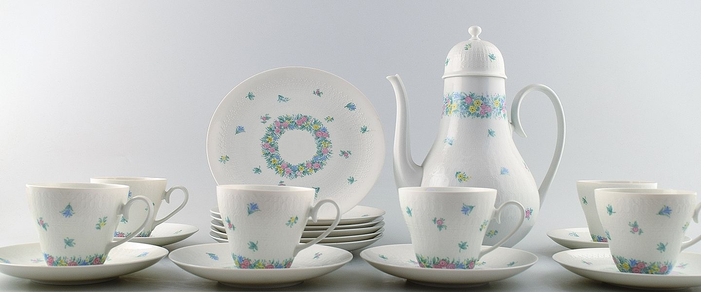 Rosenthal studio line, Wiinblad. 6 persons coffee service with floral decoration, consisting of 6 + 6 + 6 coffee cups, saucers, dessert plates, coffee pot.