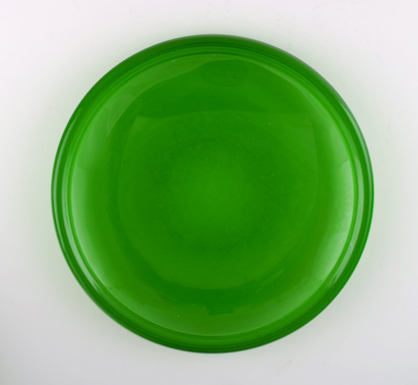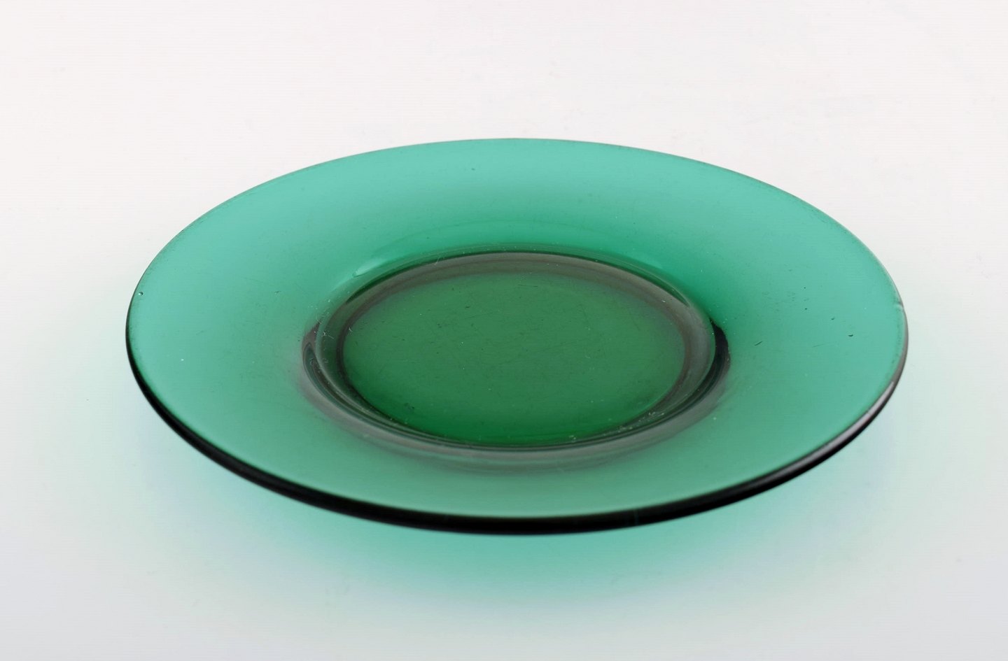 6+6 tallerkener/assietter i grønt kunstglas, Josef Frank. Firma : Reijmyre/Gullaskruf. I flot stand. Måler : 19 og 16 cm.
