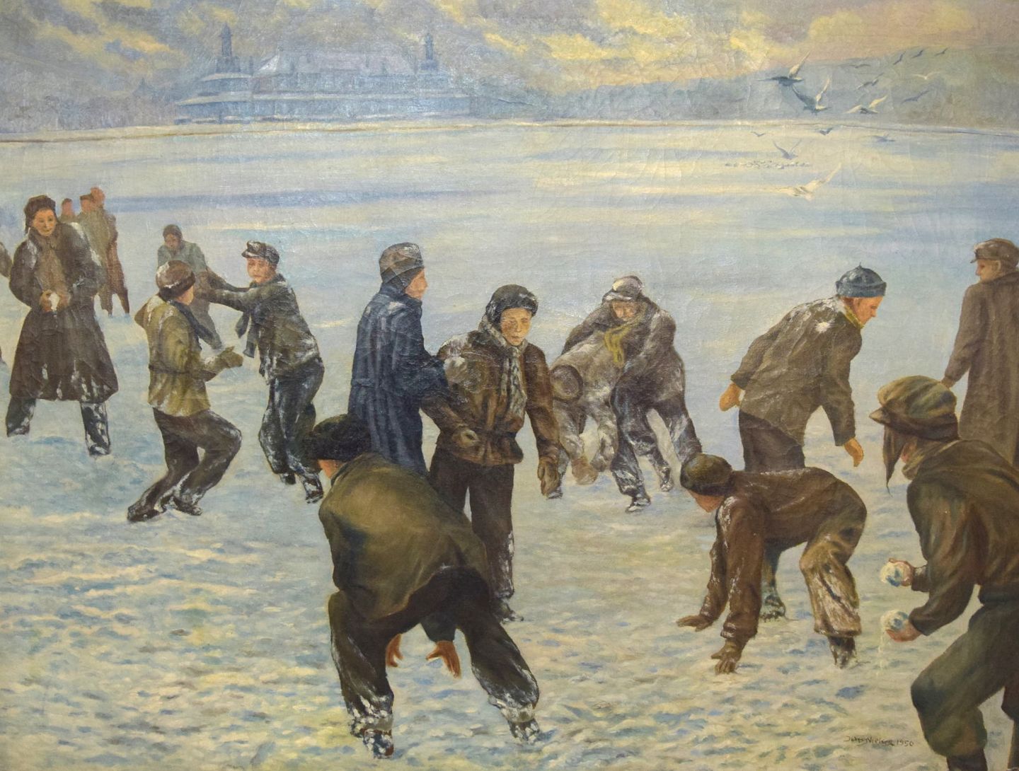 Johannes Nielsen. Winter Scene from Copenhagen. Snowball fight. Oil on canvas. Signed: Johns Nielsen 1950. Measures 117 cm x 111 cm. The frame measures 3.5 cm. In very good condition.
