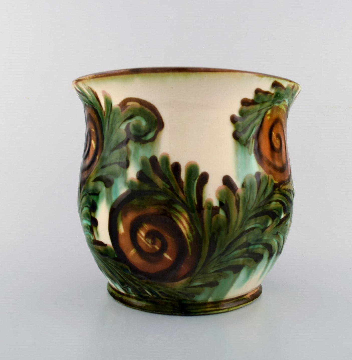 Kähler, Denmark, large glazed stoneware vase/flower pot holder. 1920 s. beautiful cow horn glaze. Stamped. Measures: 20.5 x 18.5 cm. In perfect condition.