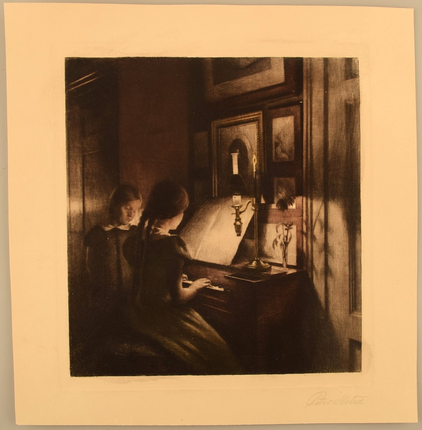 Peter Ilsted: Interiør med to piger ved klaveret. Signeret Peter Ilsted. Farvemezzotinte. Pladestørrelse 23,5 cm. x 21,5 cm. I god stand.