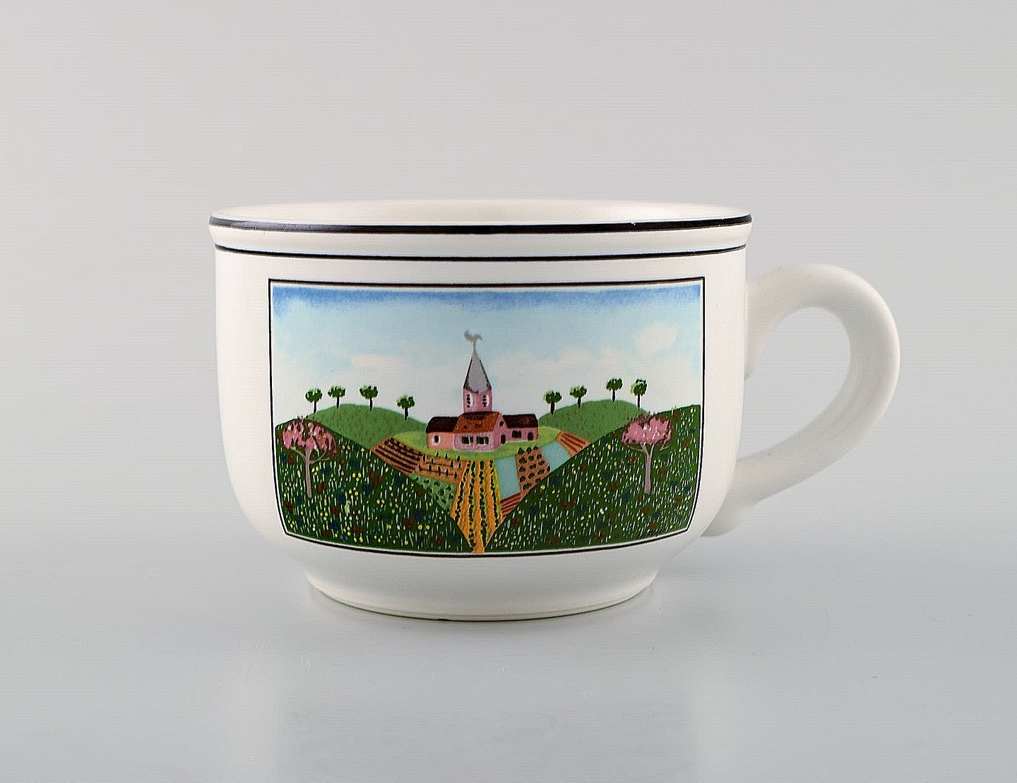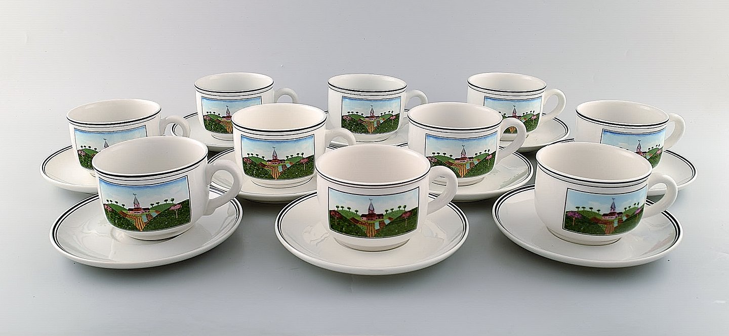 Villeroy & Boch Naif coffee service in porcelain. A set of 10 large cups with saucers decorated with naivist village motif.