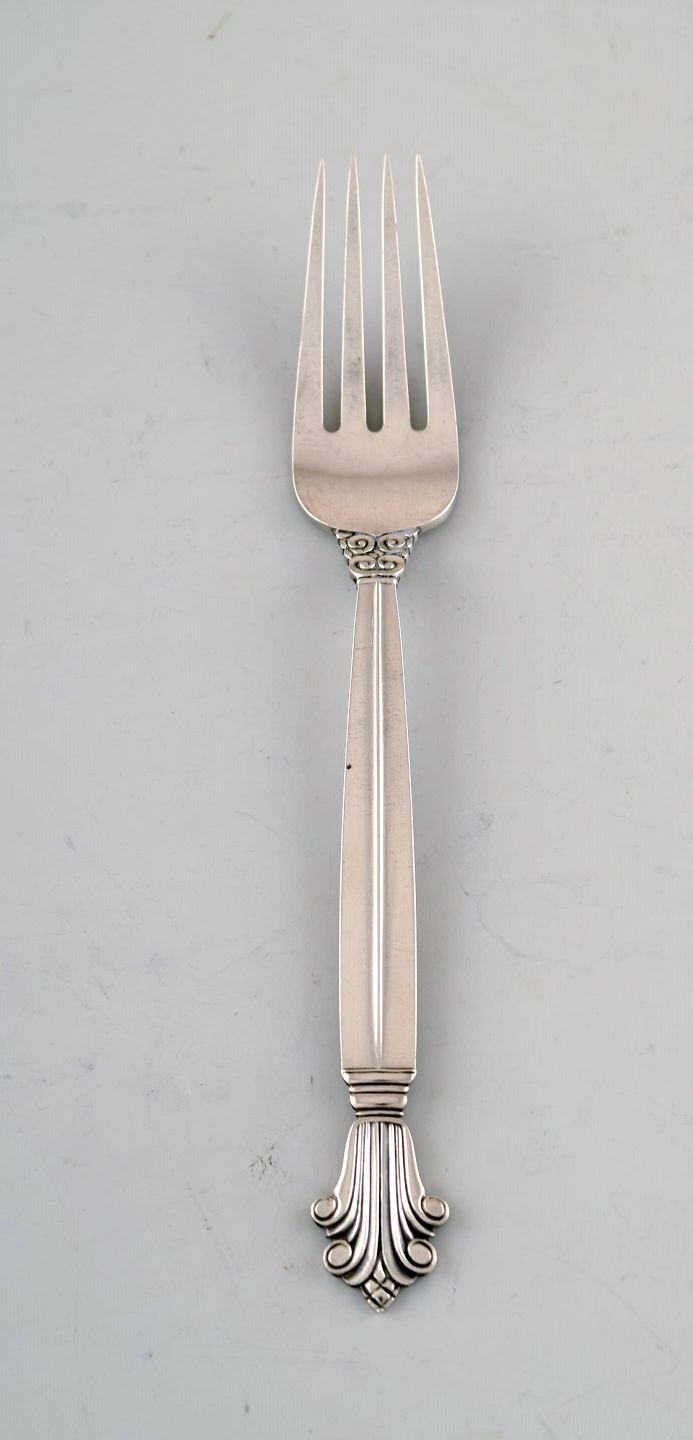 Georg Jensen Dronning frokostgaffel i sterlingsølv. Tre stk på lager. Designer: Johan Rohde. Længde: 17 cm. Stemplet. I flot stand.