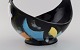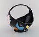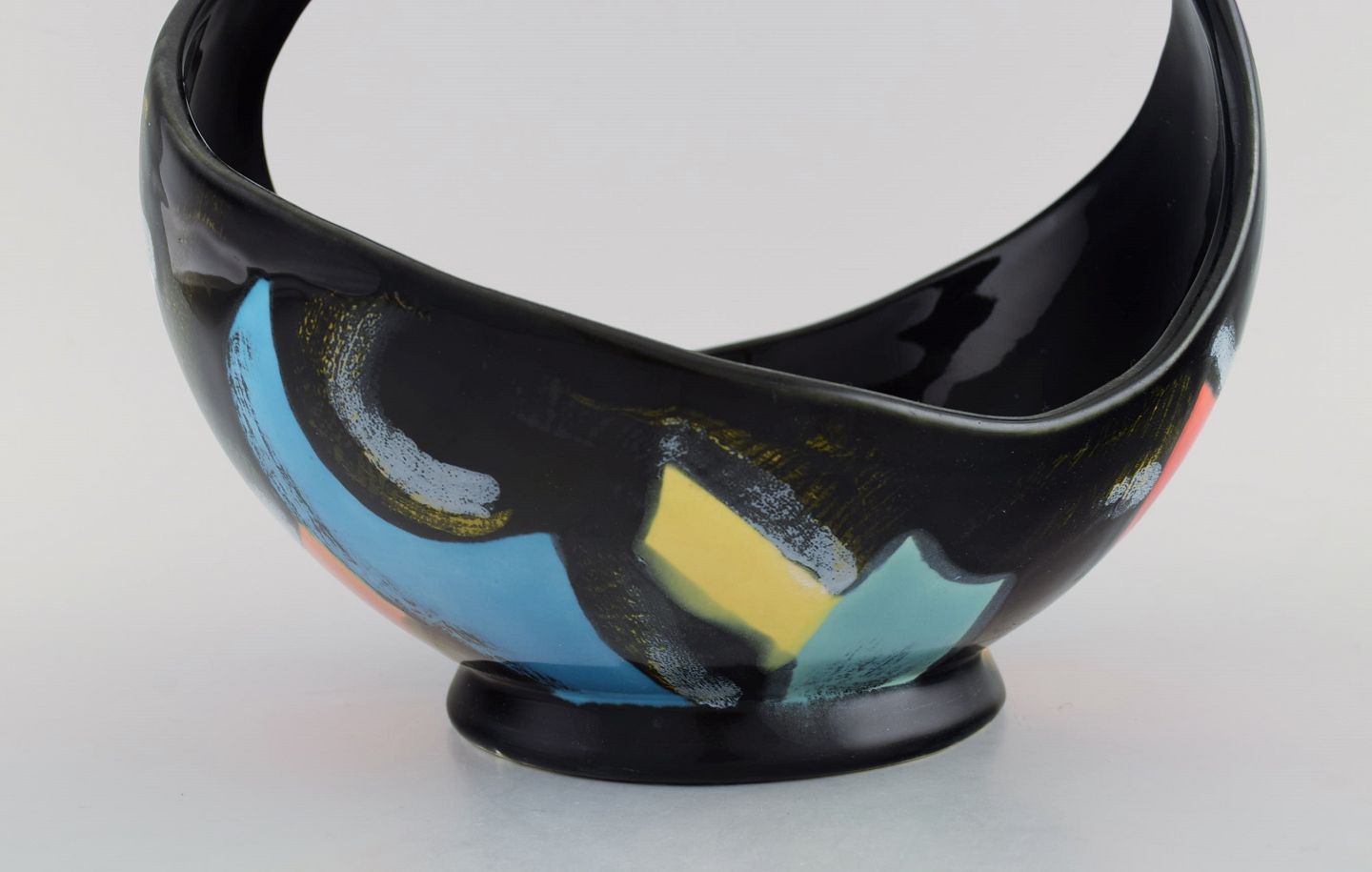 Longwy, France. Equinoxe basket in glazed ceramics. Abstract polychrome decoration on black background. Mid-20th century.
