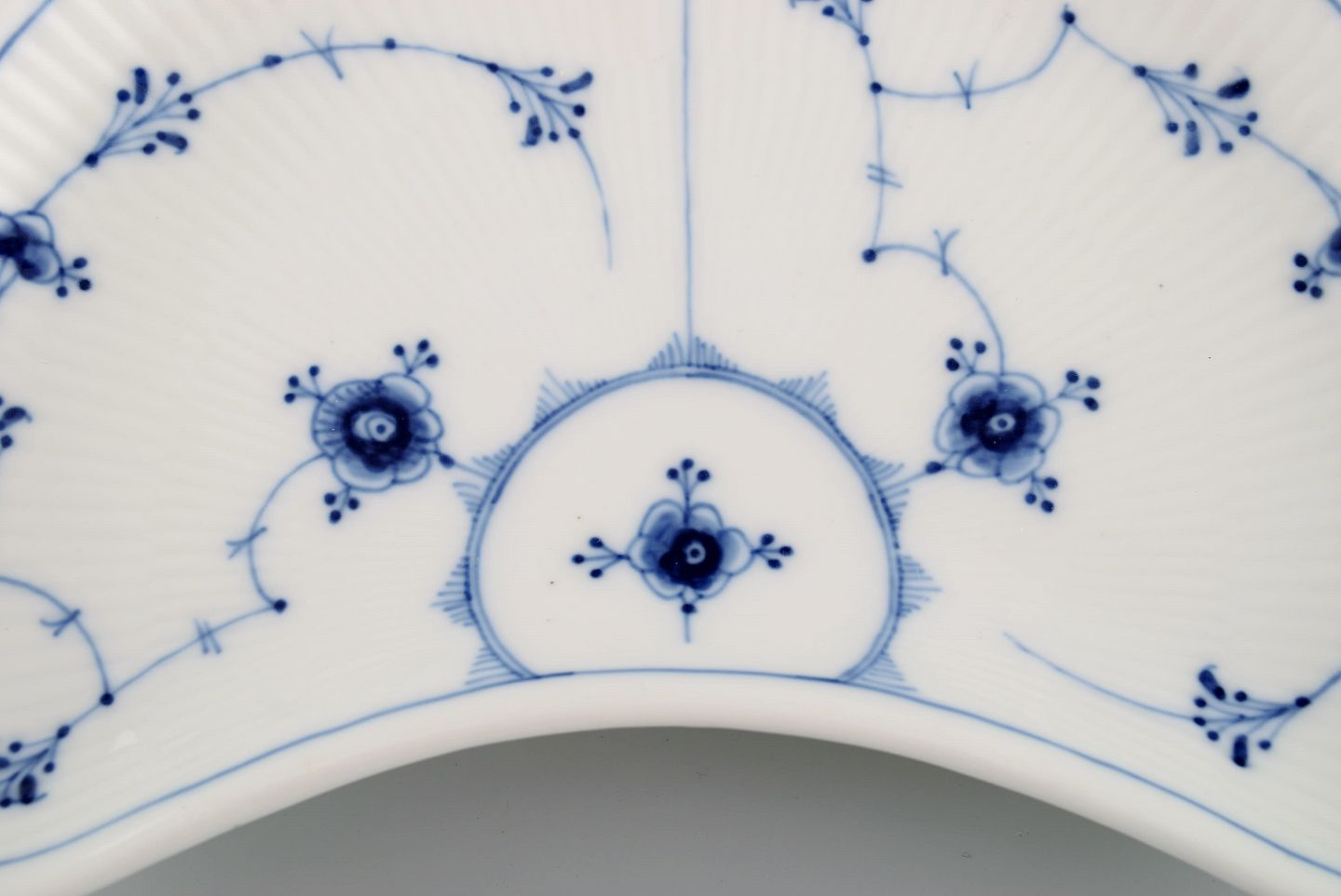 Antikt Royal Copenhagen Musselmalet Riflet fad. Sjælden model. Midt 1800-tallet. Måler: 22 x 13,5 cm. I flot stand. Signeret. 1. Sortering.