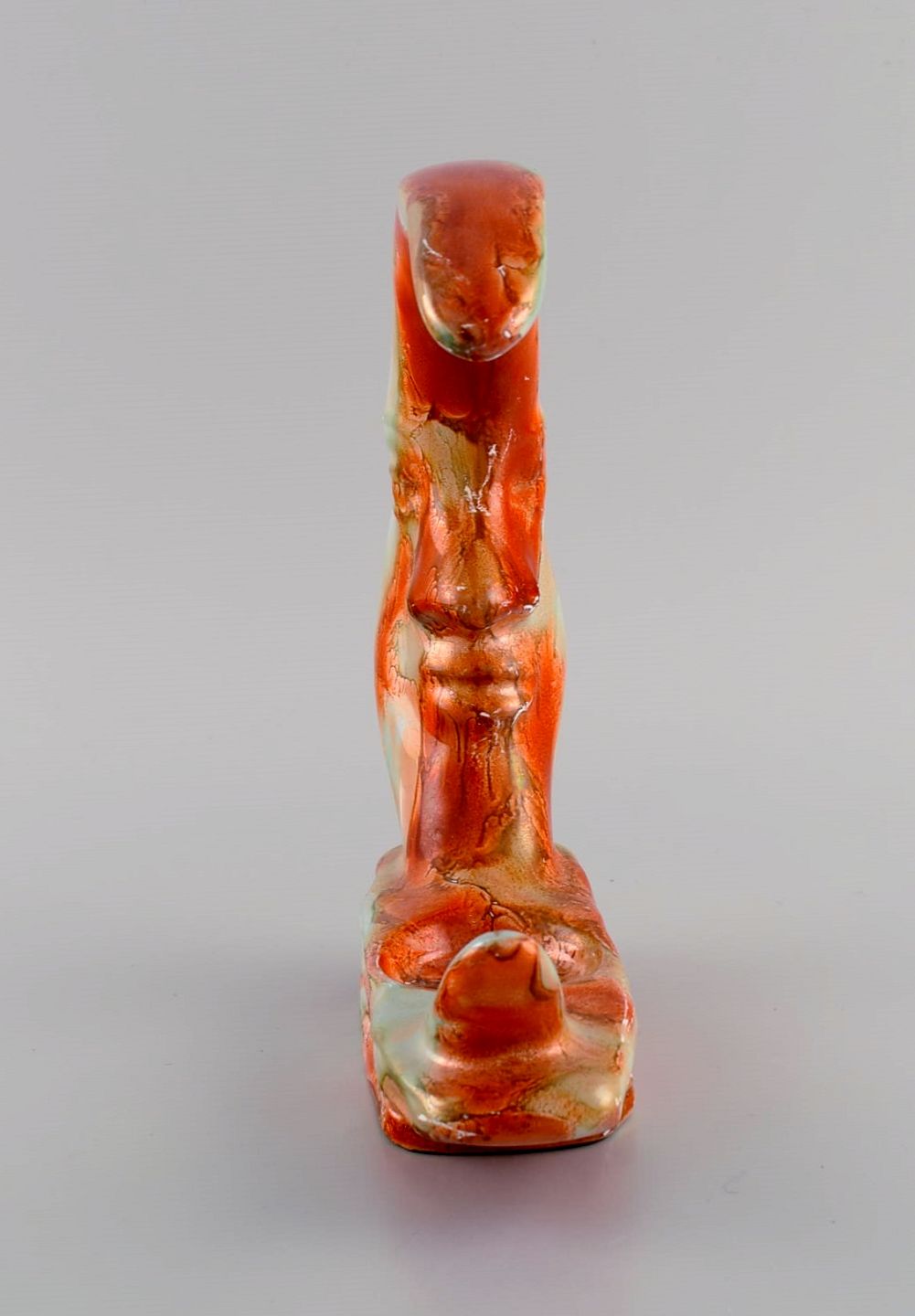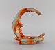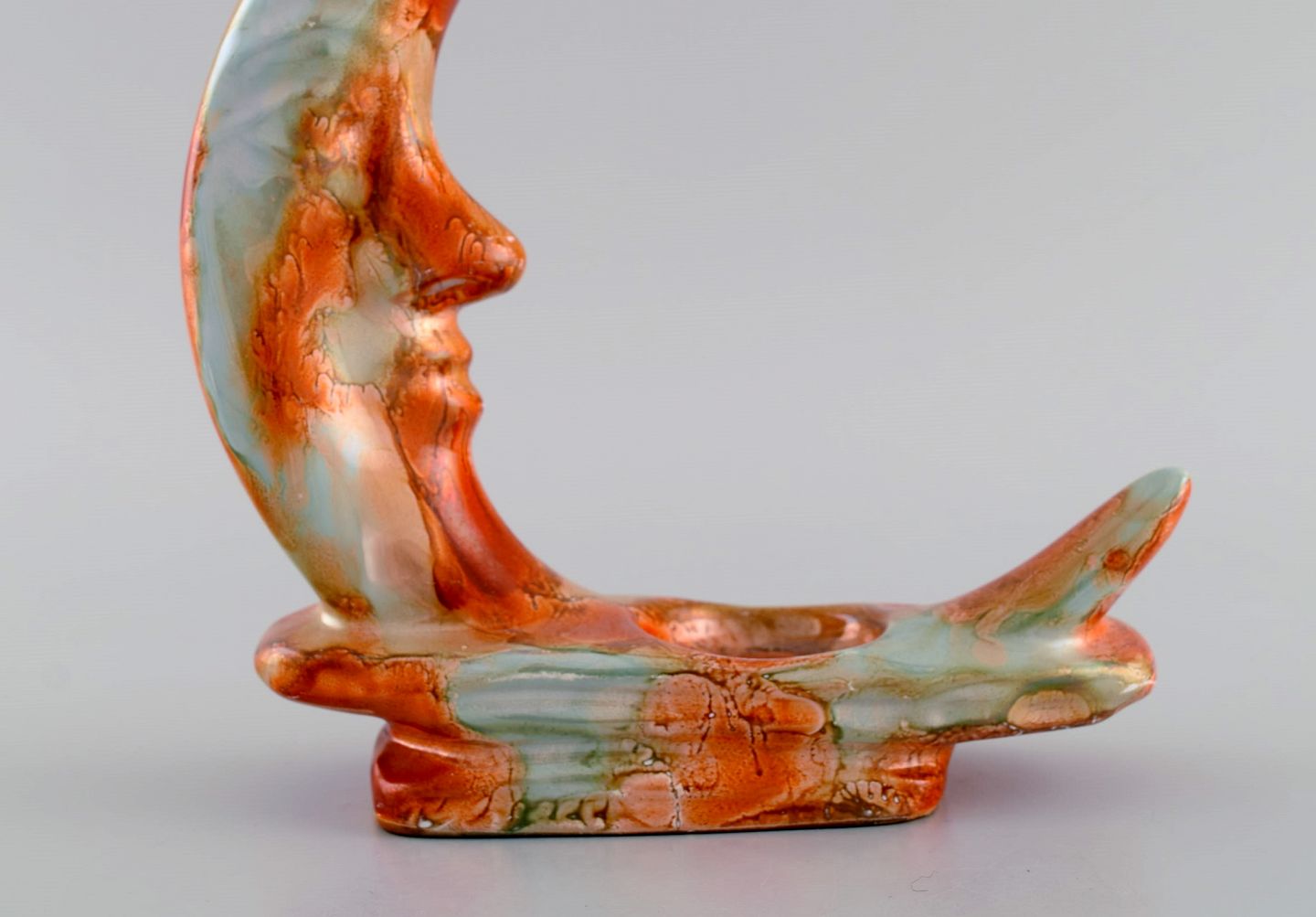 Europæisk studiokeramiker. Fyrfadslysholder formet som månen i glaseret keramik. Smuk marmoreret glasur i orange og perlemor nuancer. Sent 1900-tallet. Måler: 18,5 x 17 cm. I flot stand.