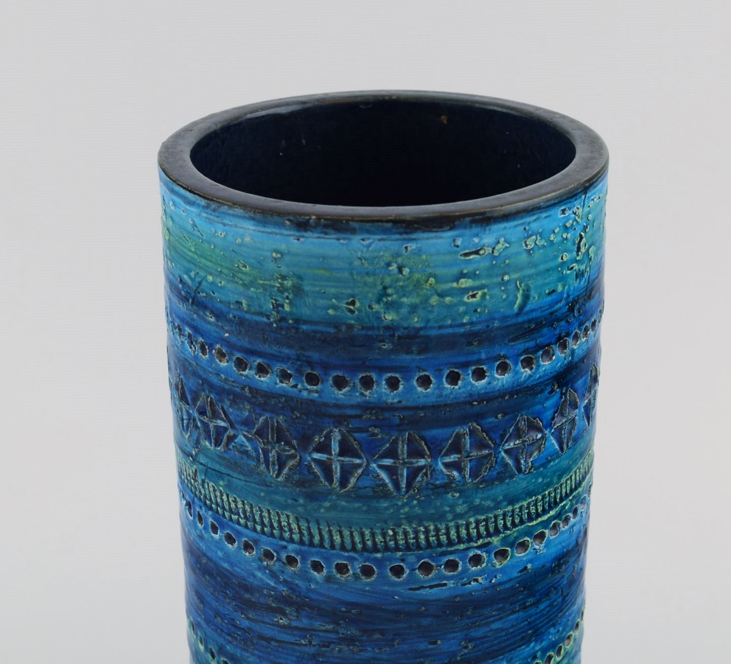 Aldo Londi for Bitossi. Cylindrisk vase i Rimini-blå glaseret keramik med geometriske mønstre. 1960'erne.