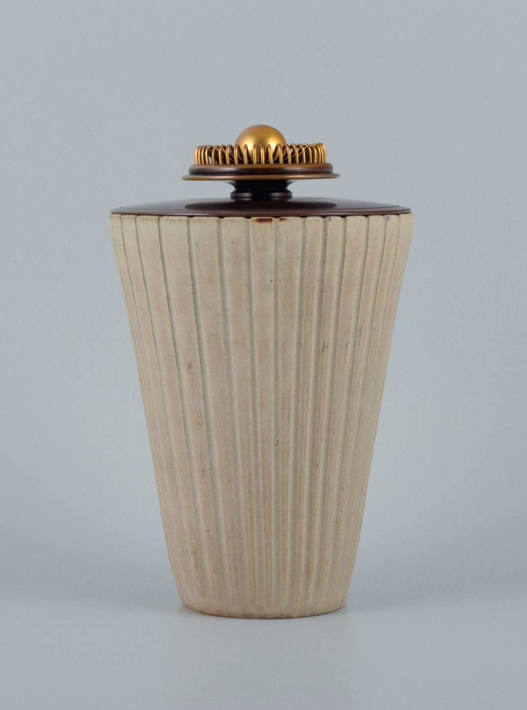 Arne Bang, stor keramikvase i rillet design med tilhørende bronzelåg.