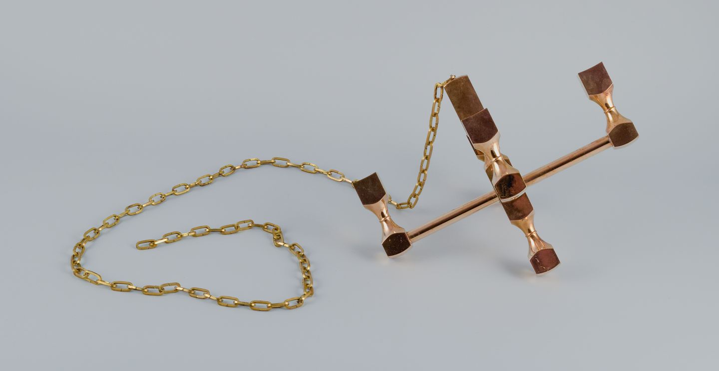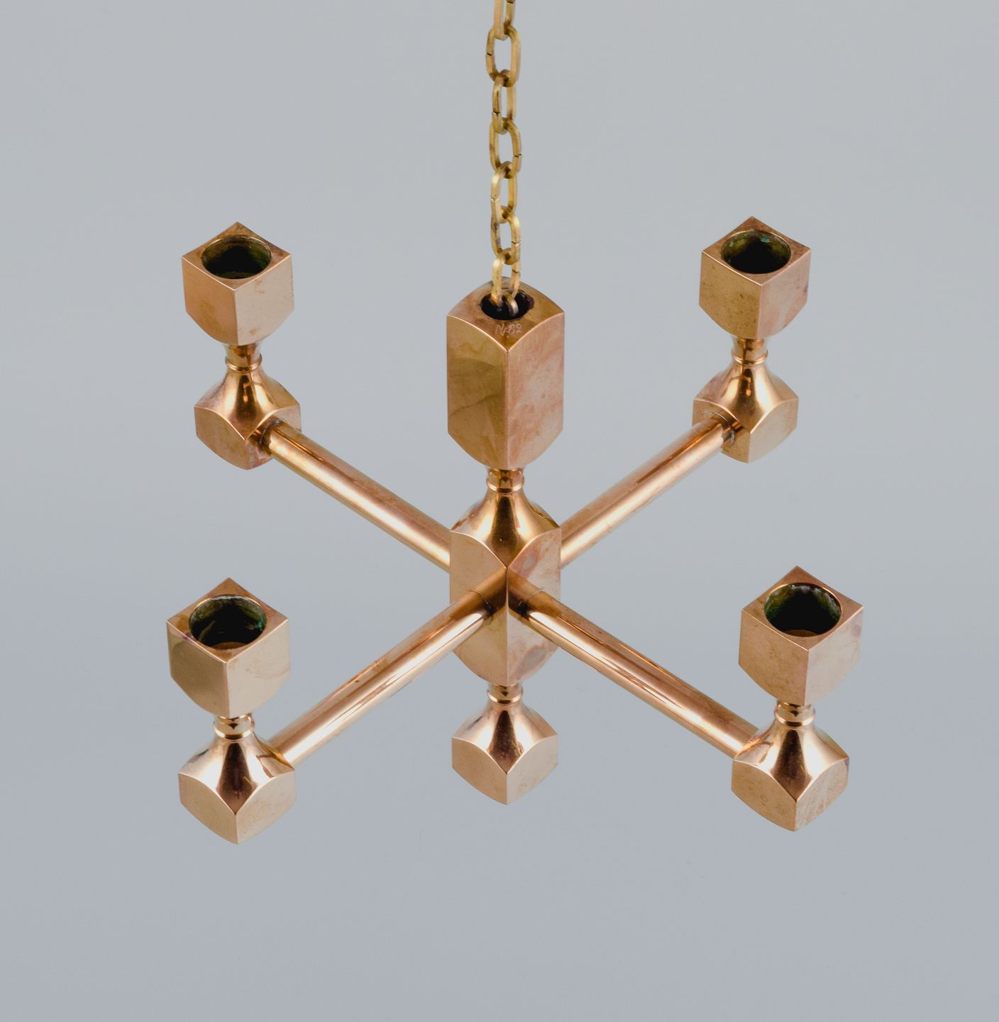 Gusum Metall, Sverige, lysekrone i massiv messing til fire stearinlys. Svensk design. Ca. 1970’erne. Signeret i top. Perfekt stand. Mål: H 20,0 (eksklusiv kæde) D 25,0 cm. Kæde måler ca. 118 cm.