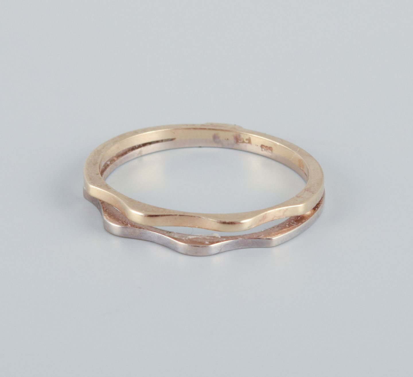 14 karat guldring i hvidguld og rødguld. Modernistisk design. Midt 1900-tallet. Guldsmedsinitialer SC. I flot stand. Ringstørrelse: 18 mm.