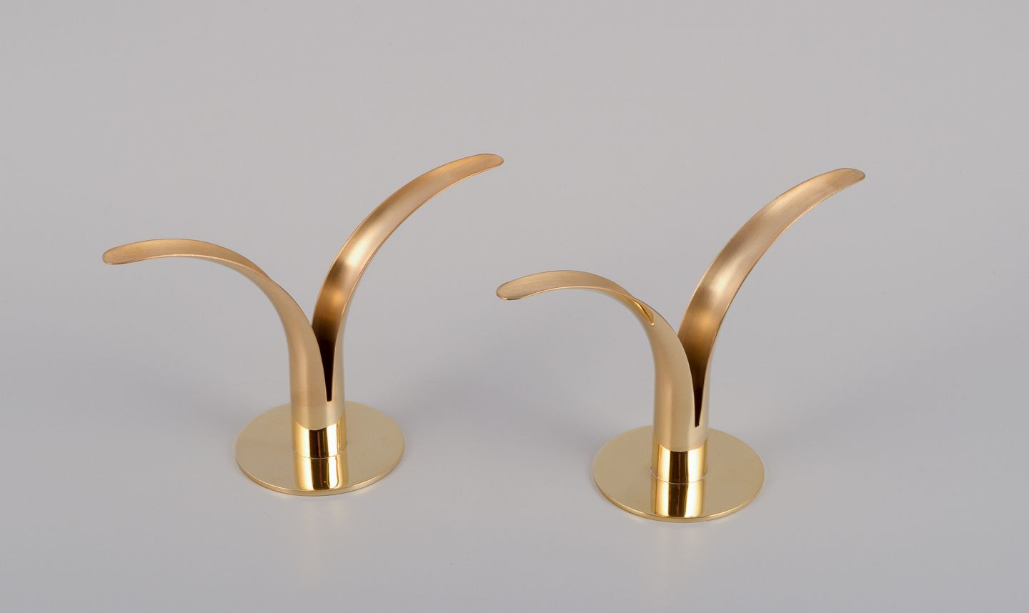 Ivar Ålenius Björk (1905-1978), Ystad Metall. Et par ”Liljan” lysestager i messing. Svensk designklassiker. 2000-tallet. Stemplet. Perfekt stand. Mål: H 13,0 cm. x D 22,0 cm.