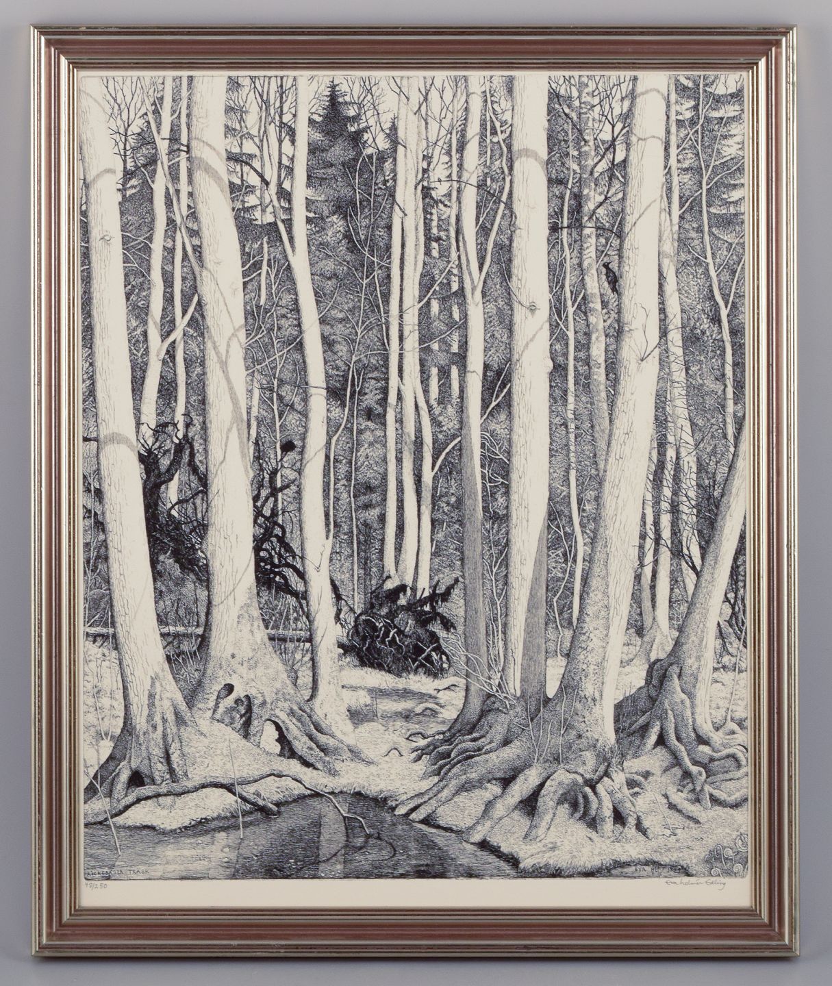 Eva Holmén-Edling (1942), Swedish artist. Woodcut on Japan paper. Forest scene.
