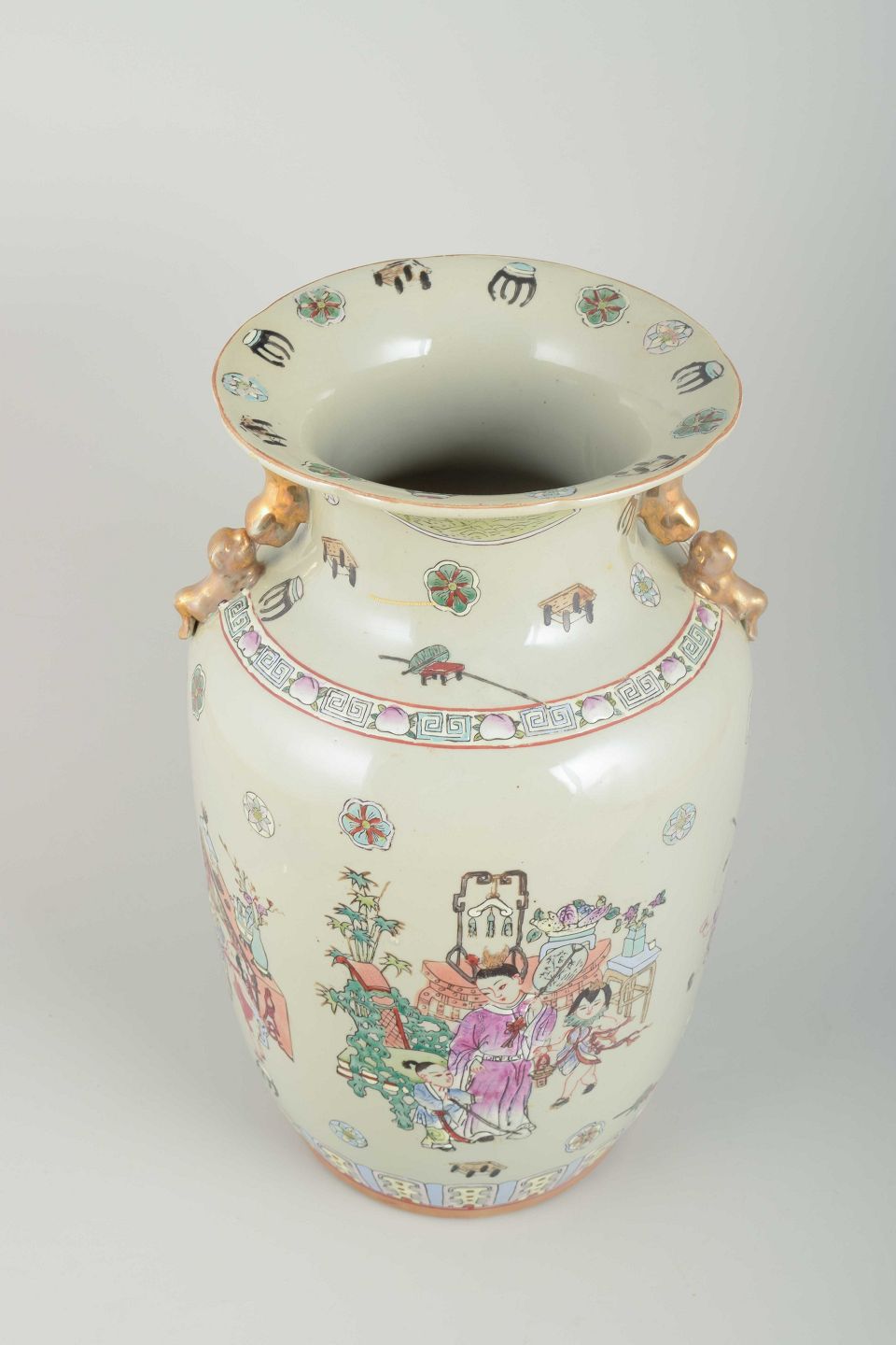 Chinese porcelain vases of the 20th century combine traditional decorative forms with modern production techniques. Painted scenes depicting figures from classical Chinese culture are characteristic, while gilt lion handles highlight their link to earlier imperial prototypes.