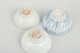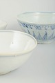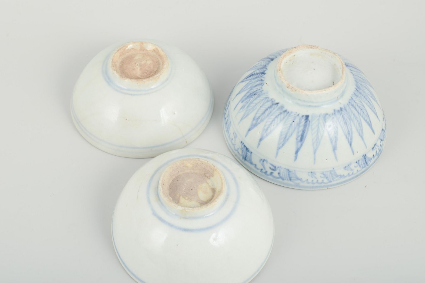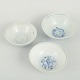 Three thrown porcelain bowls with underglaze decoration in blue tones. Two decorated inside with floral and leaf motifs, the third with simple concentric circles.