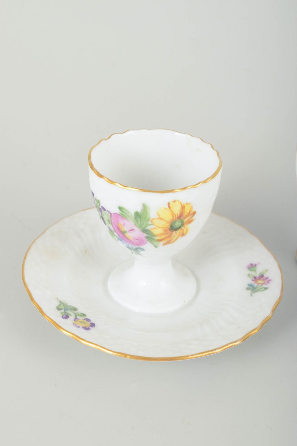Three porcelain egg cups, two with fixed saucers, decorated with hand-painted flowers in the classic “Saxon Flower” pattern and gilded rim.