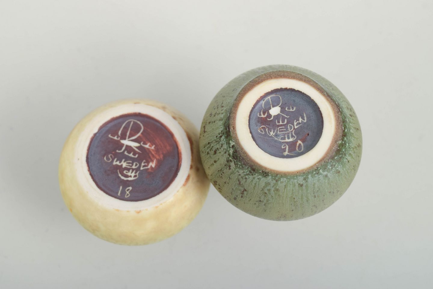 Carl-Harry Stålhane (1920–1990) was one of Rörstrand’s most significant designers and a key figure in Swedish modernist ceramics. His work combined refined forms with sophisticated glaze experimentation, often produced in small batches or as unique pieces, making his miniature vases highly collectible today.