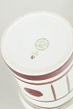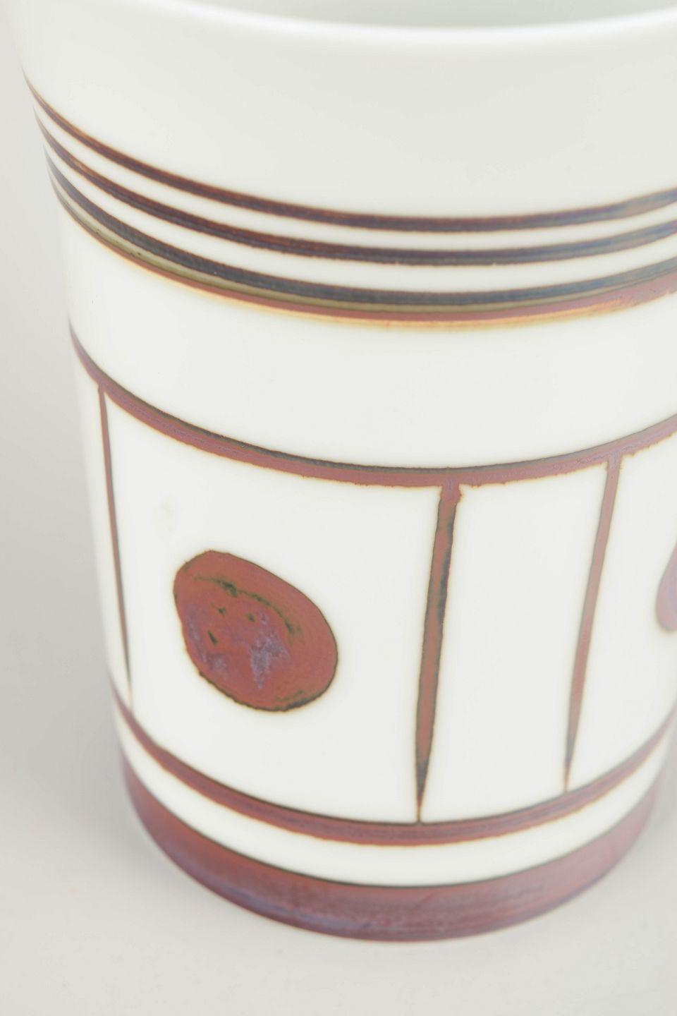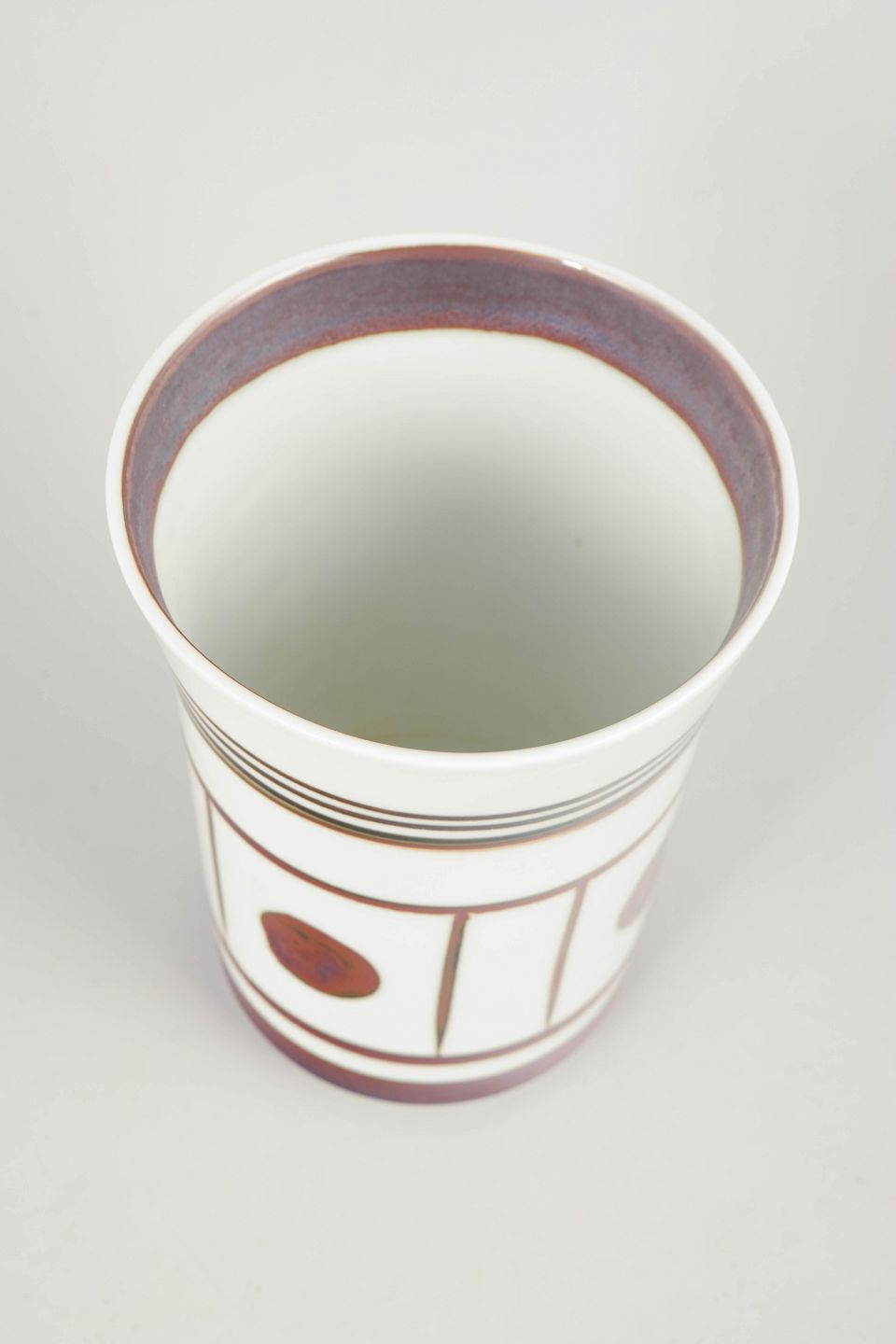 Cylindrical faience vase with white glaze and graphic decoration in brown and violet tones. The design features bands, linear elements and circular motifs, characteristic of the Trude series and reflective of the restrained modernist aesthetic of the 1970s.