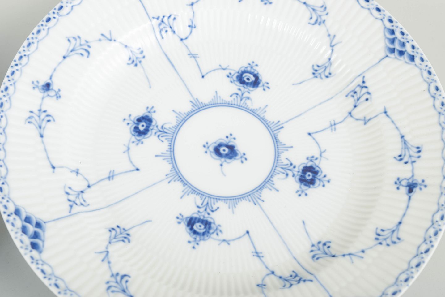 Royal Copenhagen was founded in 1775 in Copenhagen under royal charter. The factory is internationally recognised for its hand-painted porcelain and high artistic standards. Blue Fluted Half Lace is a variation of the classic Blue Fluted service, combining fluted surfaces with a decorative lace border executed with exceptional craftsmanship.