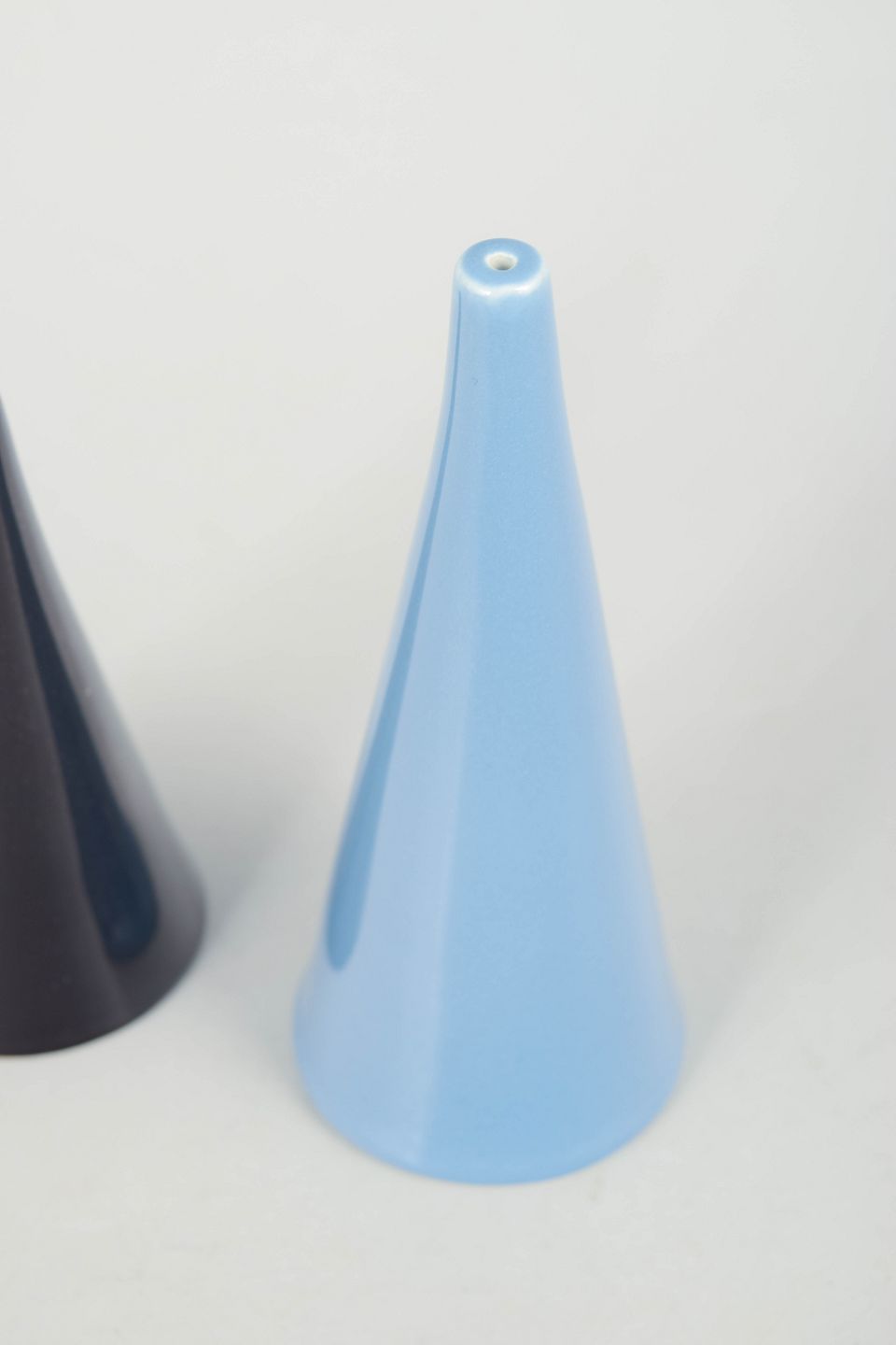 Håndlavet sæt i glaseret stentøj med koniske former i henholdsvis lys blå og mørk glasur. Enkle og skulpturelle former med tydelig modernistisk karakter. Model Colorado.