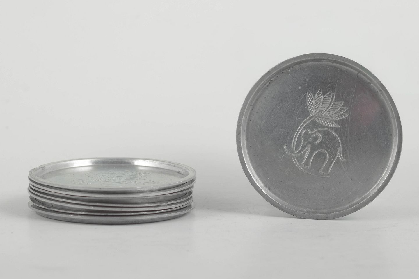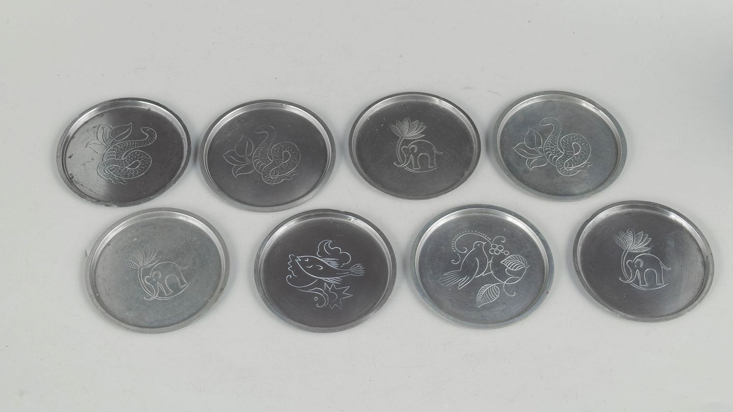 Sæt af otte flaskeunderlag i tin med indgraverede dyremotiver i et stiliseret art deco formsprog. Model 1166.