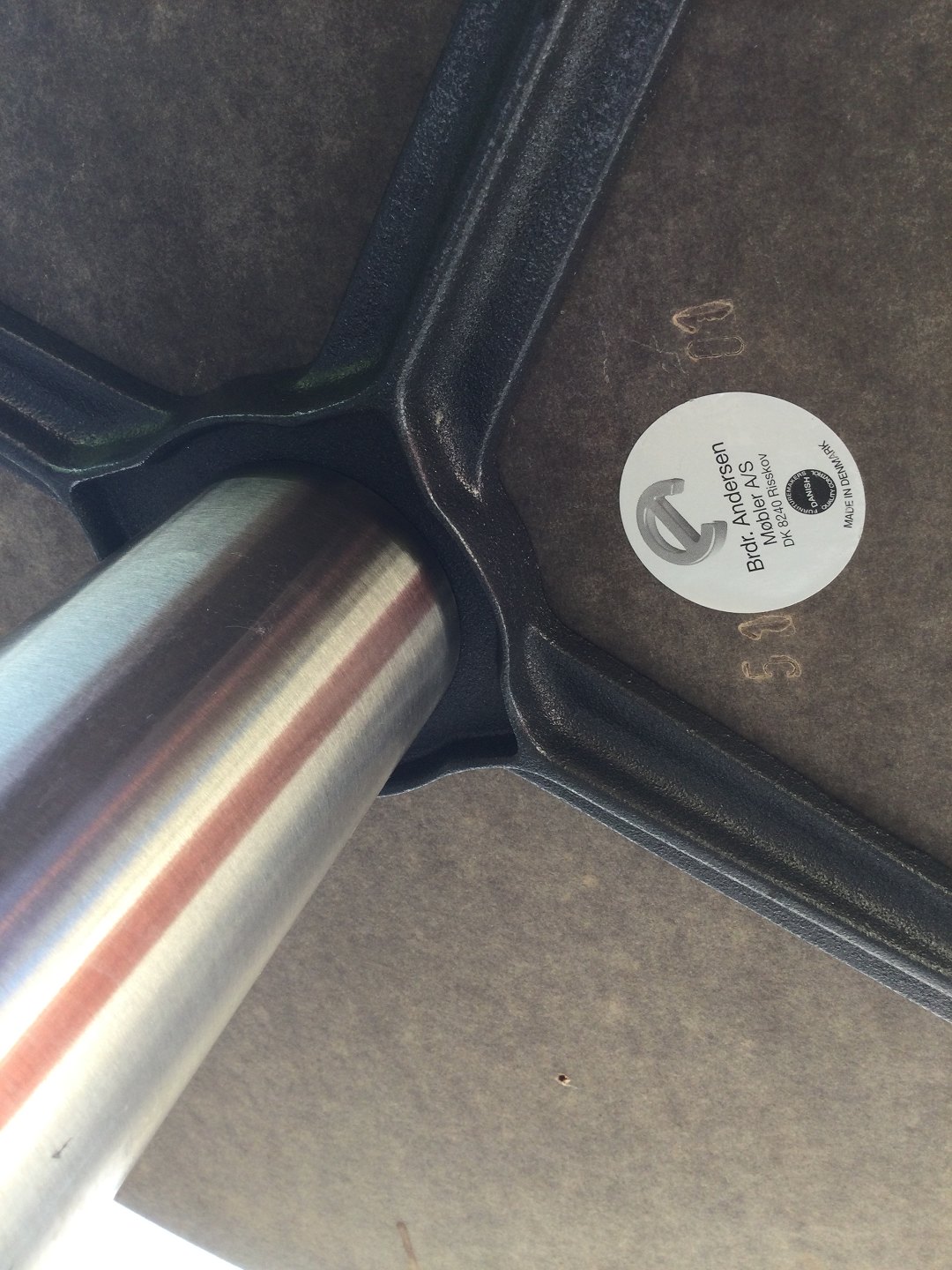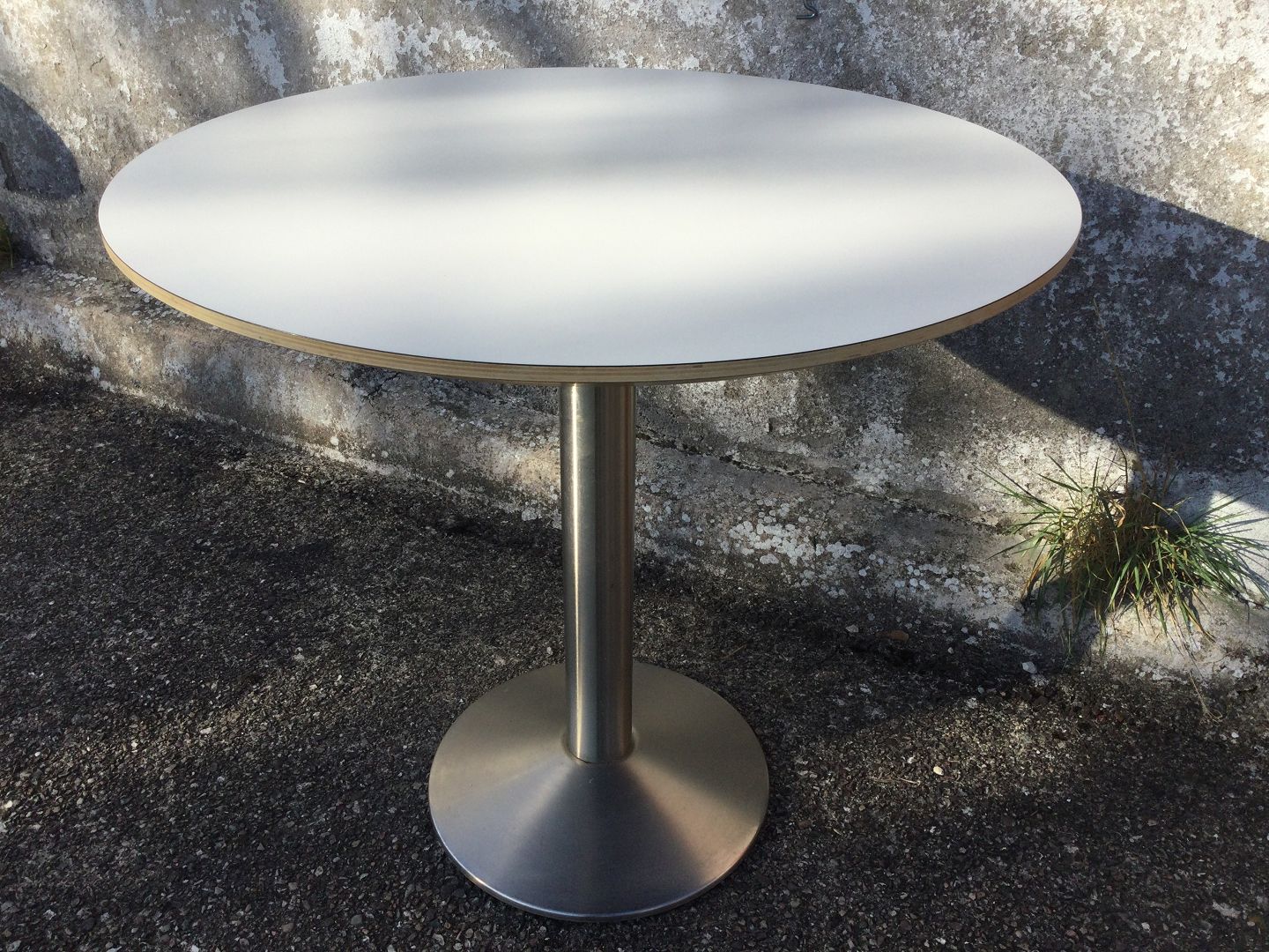 Round laminate table with metal base from Brdr. Andersen. Diameter 80 cm, height 74 cm. Really nice condition