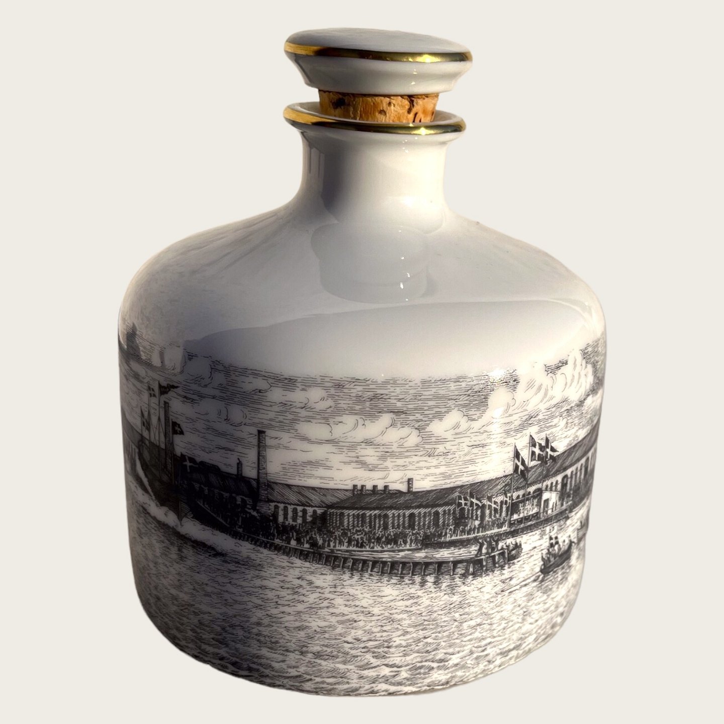 Bing & Grøndahl, Bottle with cork stopper, Motif of Burmeister & Wain shipyard 1874 #7549, 13cm high, 10cm in diameter *Nice condition*