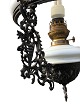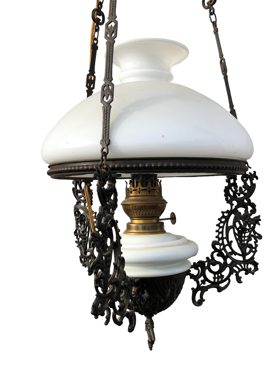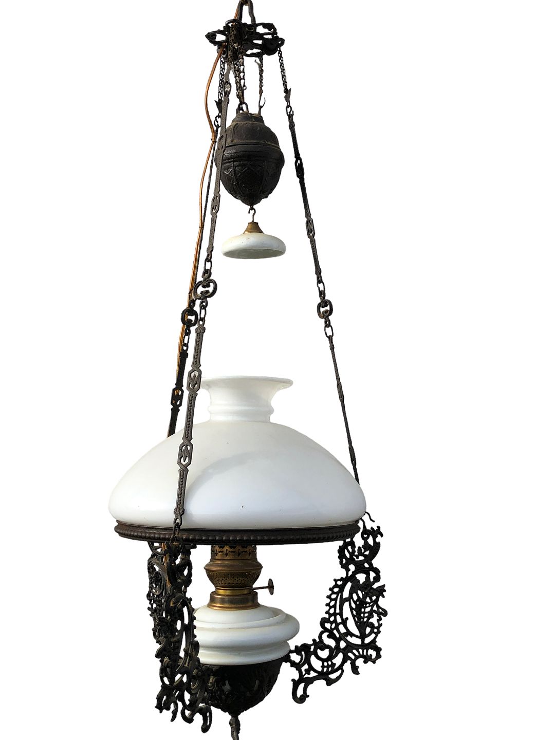 Large older kerosene lamp with heavy lifting/lowering weight, converted to electricity, needs cleaning, but is otherwise in good condition.