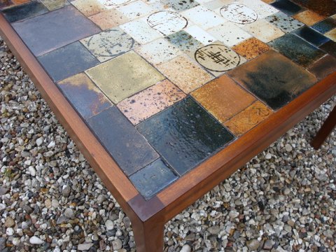 SolgtSofabord med kakler. Træet er mahogni og godt bordet er af godt dansk design fra 1960érne.