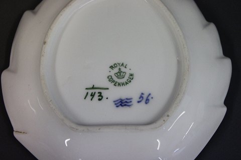 Royal Copenhagen musselmalet blad formet kagefad, nr. 143. Kagefadet blev lavet mellem 1889 og 1922.
