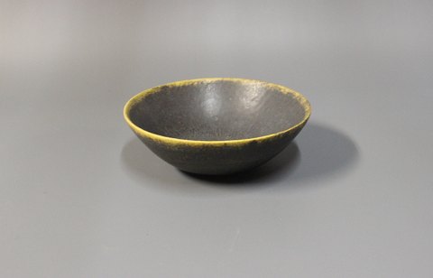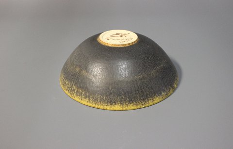SolgtBrun stentøjsskål med gul kant signeret Eigil Henriksen, Danmark.
