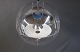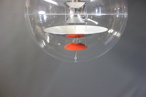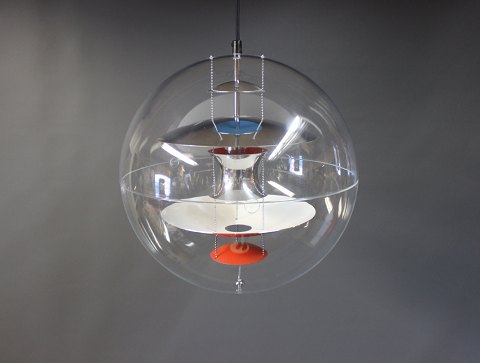 Verner Panton Globe designet i 1969. Lampen er af transparent akryl med 5 ned hængte metal reflektorer, som er lakeret i hvid, rød og blå.
