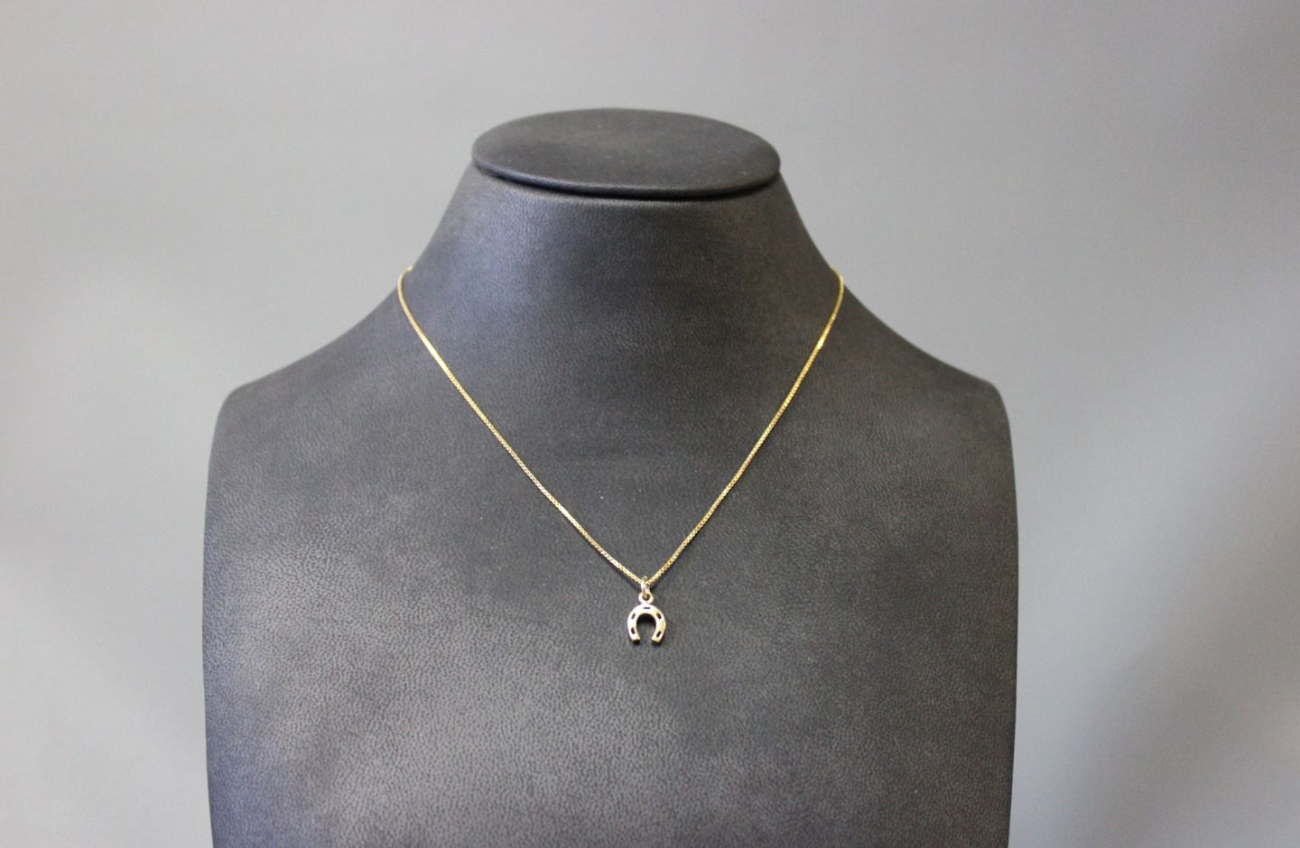 Kæde med vedhæng i 8 kt. guld i form af en hestesko, forgyldt 925 sterling sølv kæde. Stemplet B.E.E.